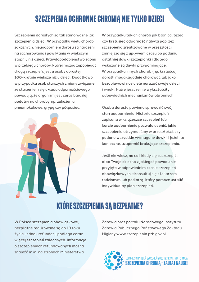 Według danych WHO w ciągu ostatnich 50 lat szczepionki uratowały życie 154 milionom osób. Szczepienia ochronne to najskuteczniejszy i najbardziej efektywny sposób zapobiegania wielu chorobom zakaźnym. Zapewniają odporność, chroniącą nas przed groźnymi chorobami. Szczepiąc siebie i swoich bliskich, chronimy także te osoby, których nie można zaszczepić z przyczyn medycznych. Szczepienia dorosłych są tak samo ważne jak szczepienia dzieci. W przypadku wielu chorób zakaźnych, nieuodpornieni dorośli są narażeni na zachorowania i powikłania w większym stopniu niż dzieci. Dodatkowo, w przypadku osób starszych, zmiany związane ze starzeniem się układu odpornościowego wraz z upływem czasu powodują, że organizm jest coraz bardziej podatny na choroby, np. zakażenia pneumokokowe, grypę czy półpasiec.