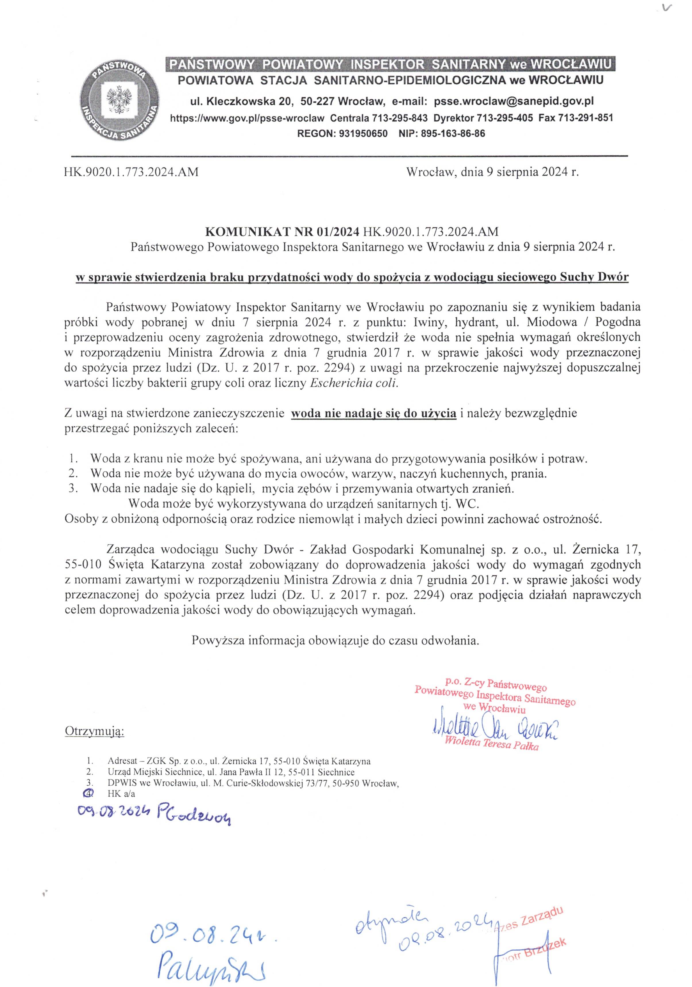 Państwowy Powiatowy Inspektor Sanitarny we Wrocławiu po zapoznaniu się z wynikiem badania próbki wody pobranej w dniu 7 sierpnia 2024 r. z punktu: Iwiny, hydrant, ul. Miodowa / Pogodna