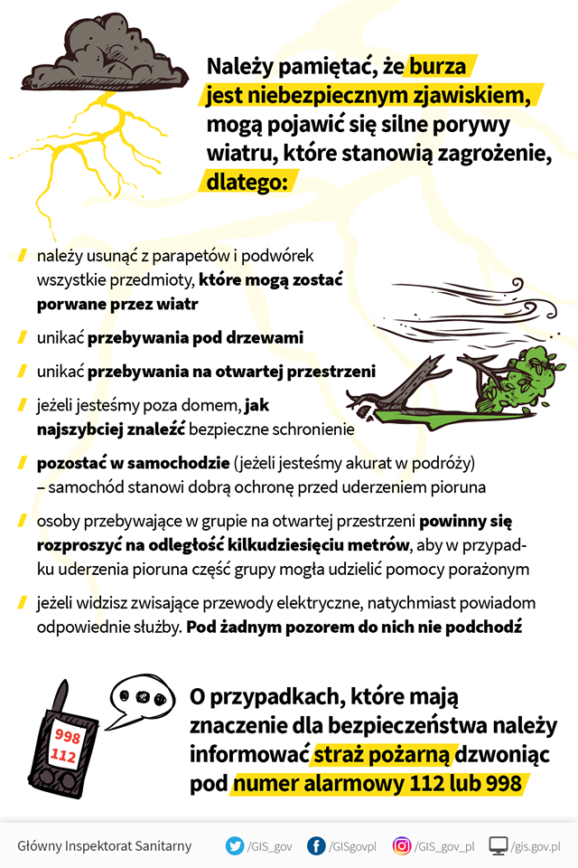 - unikać przebywania pod drzewami, pod słupami energetycznymi, niestabilnymi konstrukcjami i na otwartej przestrzeni,