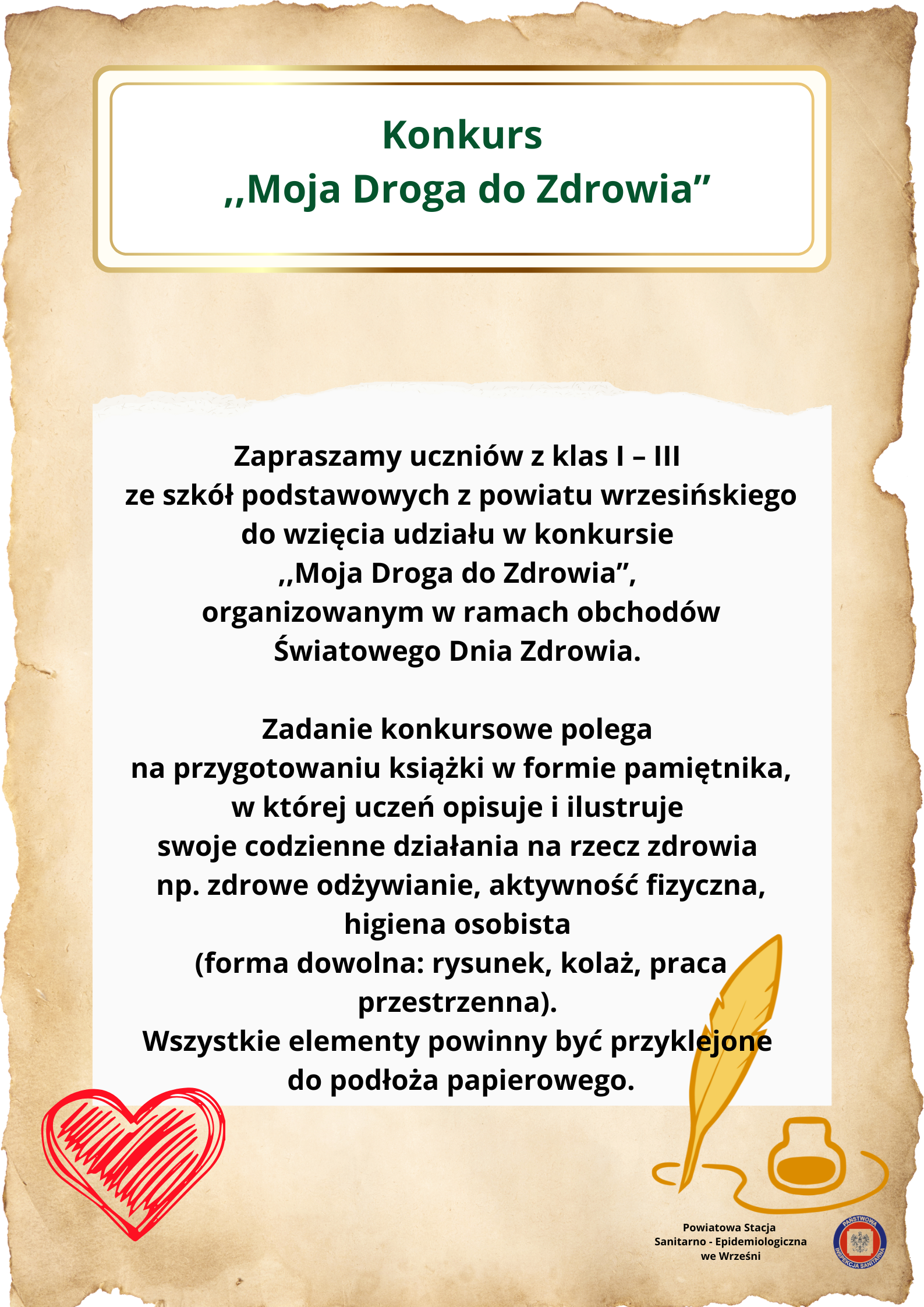 Z okazji obchodów Światowego Dnia Zdrowia serdecznie zapraszamy uczniów klas I–III ze Szkół Podstawowych z powiatu wrzesińskiego do wzięcia udziału w konkursie „Moja Droga do Zdrowia”!