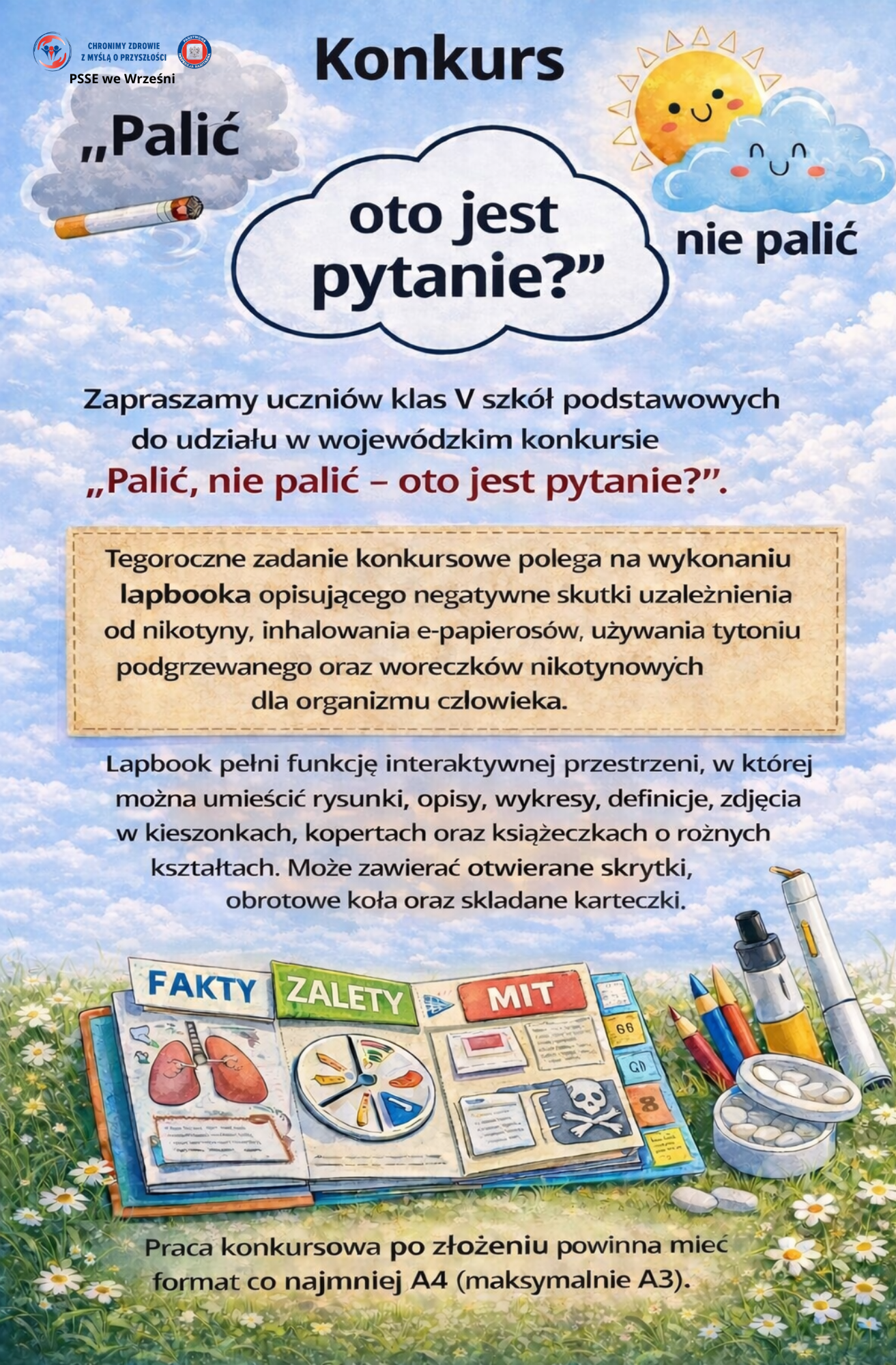 Państwowy Powiatowy Inspektor Sanitarny we Wrześni zaprasza uczniów klas V szkół podstawowych do udziału w wojewódzkim konkursie ,,Palić, nie palić – oto jest pytanie?”.