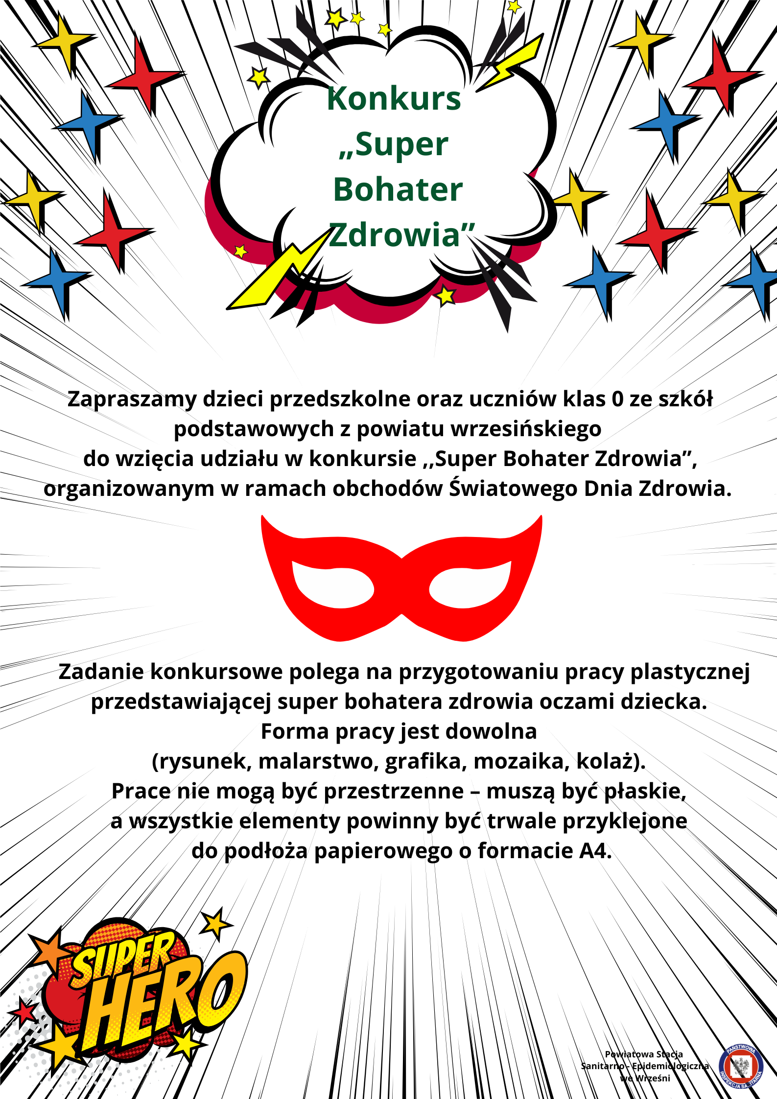 Z okazji obchodów Światowego Dnia Zdrowia serdecznie zapraszamy dzieci przedszkolne z przedszkoli z powiatu wrzesińskiego do wzięcia udziału w konkursie plastycznym „Super Bohater Zdrowia”!
