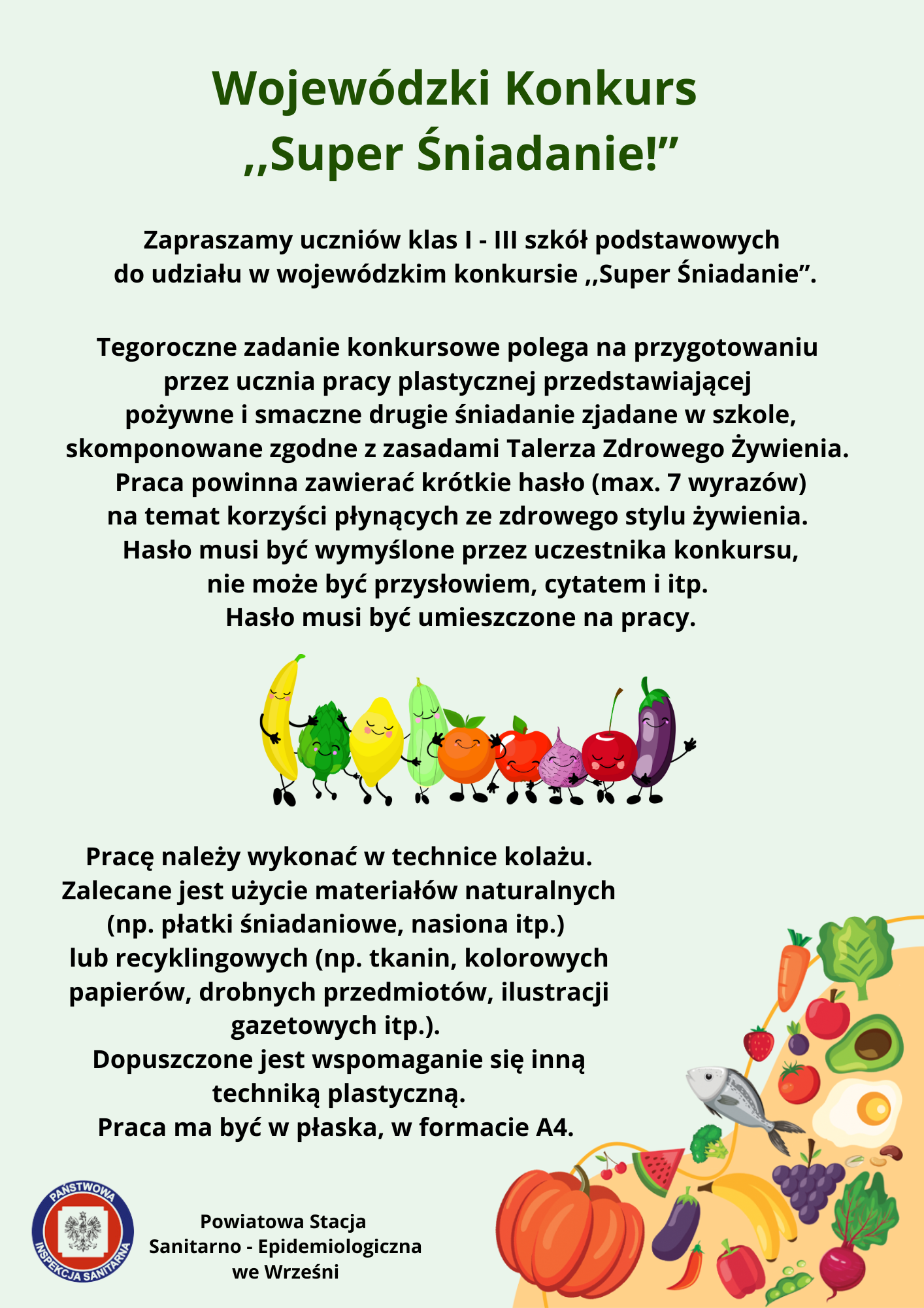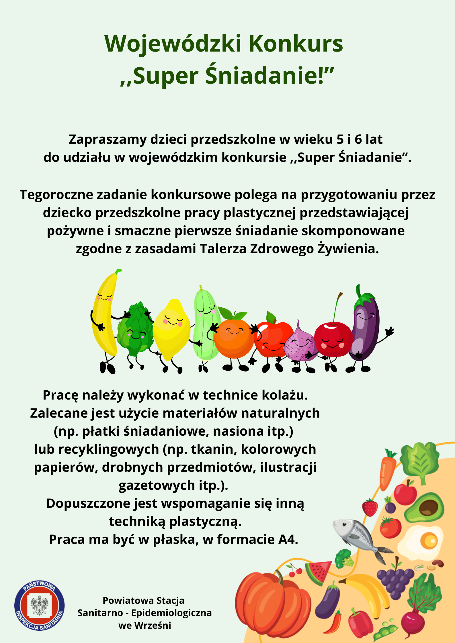 Państwowy Powiatowy Inspektor Sanitarny we Wrześni zaprasza dzieci przedszkolne w wieku 5 i 6 lat oraz uczniów klas I - III szkół podstawowych do udziału w wojewódzkim konkursie ,,Super Śniadanie”.
