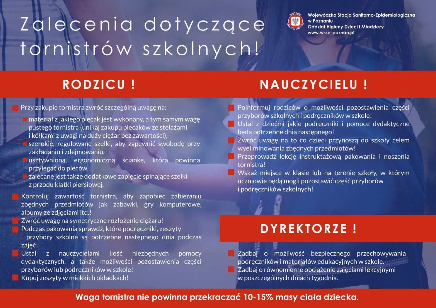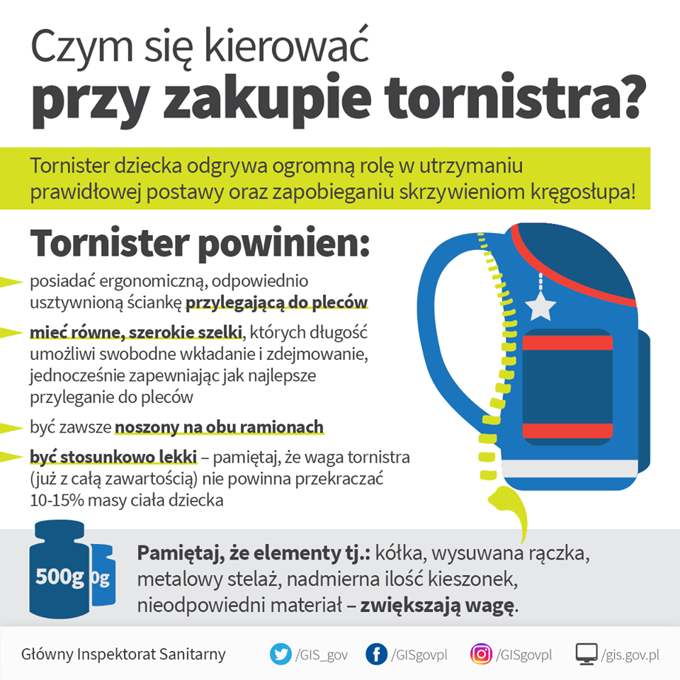 - Zgodnie z zaleceniami Głównego Inspektora Sanitarnego waga plecaka nie powinna przekraczać 10-15 proc. masy ciała ucznia.