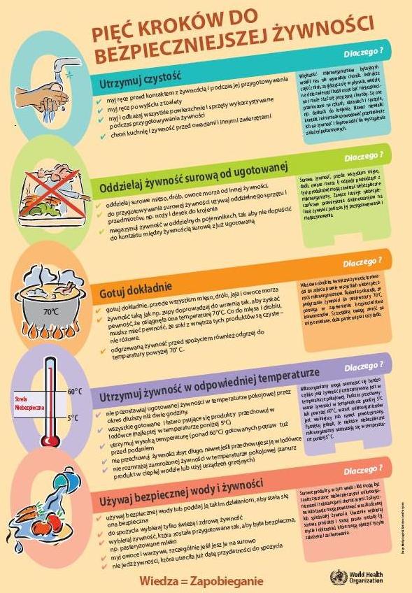 - higiena: trzeba pamiętać o częstym myciu rąk, warzyw i owoców (przed spożyciem), myciu naczyń i wyposażenia.