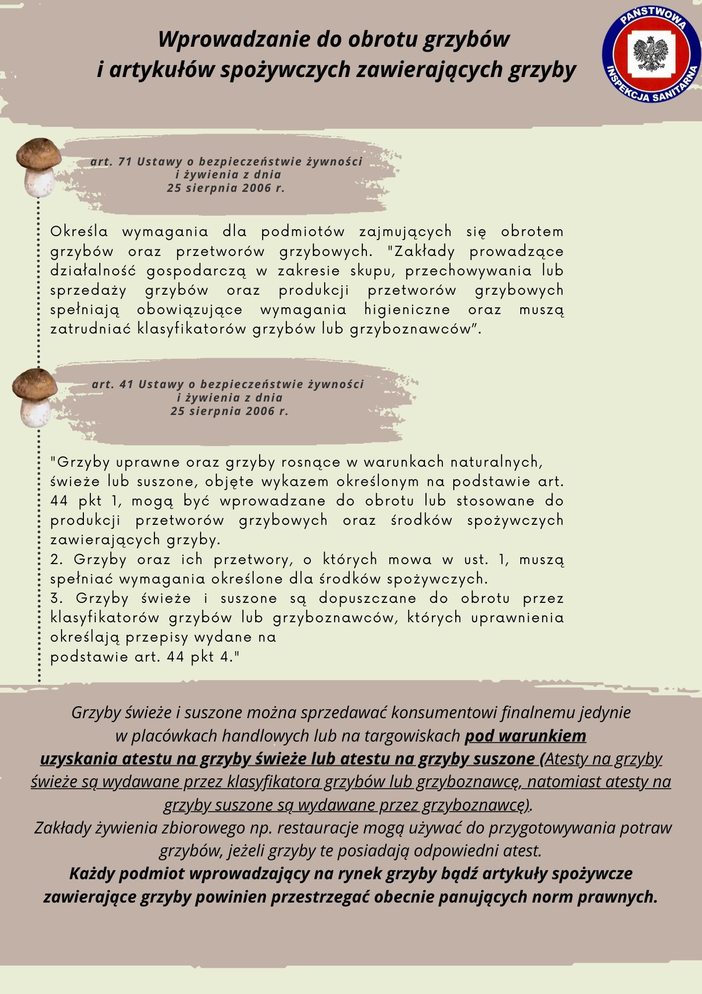 - Rozporządzeniu Ministra Zdrowia z dnia 17 maja 2011r. w sprawie grzybów dopuszczonych do obrotu lub produkcji przetworów grzybowych, środków spożywczych zawierających grzyby oraz uprawnień klasyfikatora grzybów i grzyboznawcy (Dz. U. z 2020 r. poz. 1048)
