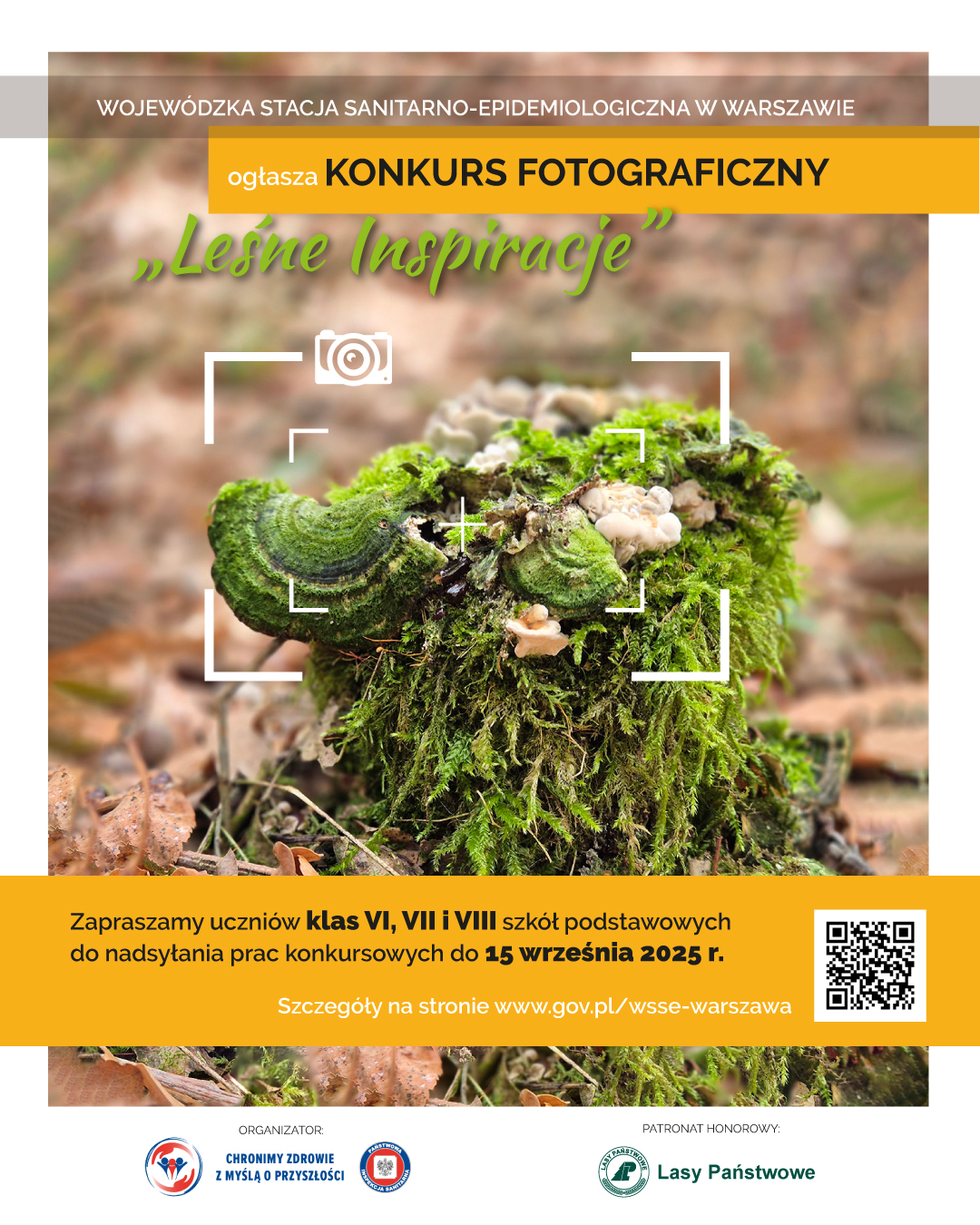 Wojewódzka Stacja Sanitarno-Epidemiologiczna w Warszawie już po raz dwunasty serdecznie zaprasza uczniów szkół podstawowych z klas VI, VII i VIII z terenu województwa mazowieckiego do udziału w Konkursie Fotograficznym pt. „Leśne Inspiracje”. Tematem przewodnim zmagań uczestników jest ukazanie piękna lasu i runa leśnego poprzez fotografie grzyba/grzybów w ich naturalnym środowisku. Konkurs od lat cieszy się popularnością wśród młodych amatorów fotografii przyrody. Nadsyłane fotografie urzekają pomysłowością i pięknem kadru oraz niejednokrotnie dojrzałością w postrzeganiu tematu.