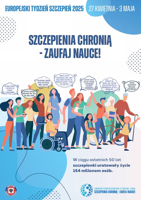 W dniach od 27 kwietnia do 3 maja 2025 r. będziemy realizować po raz kolejny Europejski Tydzień Szczepień, inicjatywę Światowej Organizacji Zdrowia, mającą na celu zwiększenie świadomości społeczeństwa na temat roli szczepień w zapobieganiu chorobom i ochronie życia.