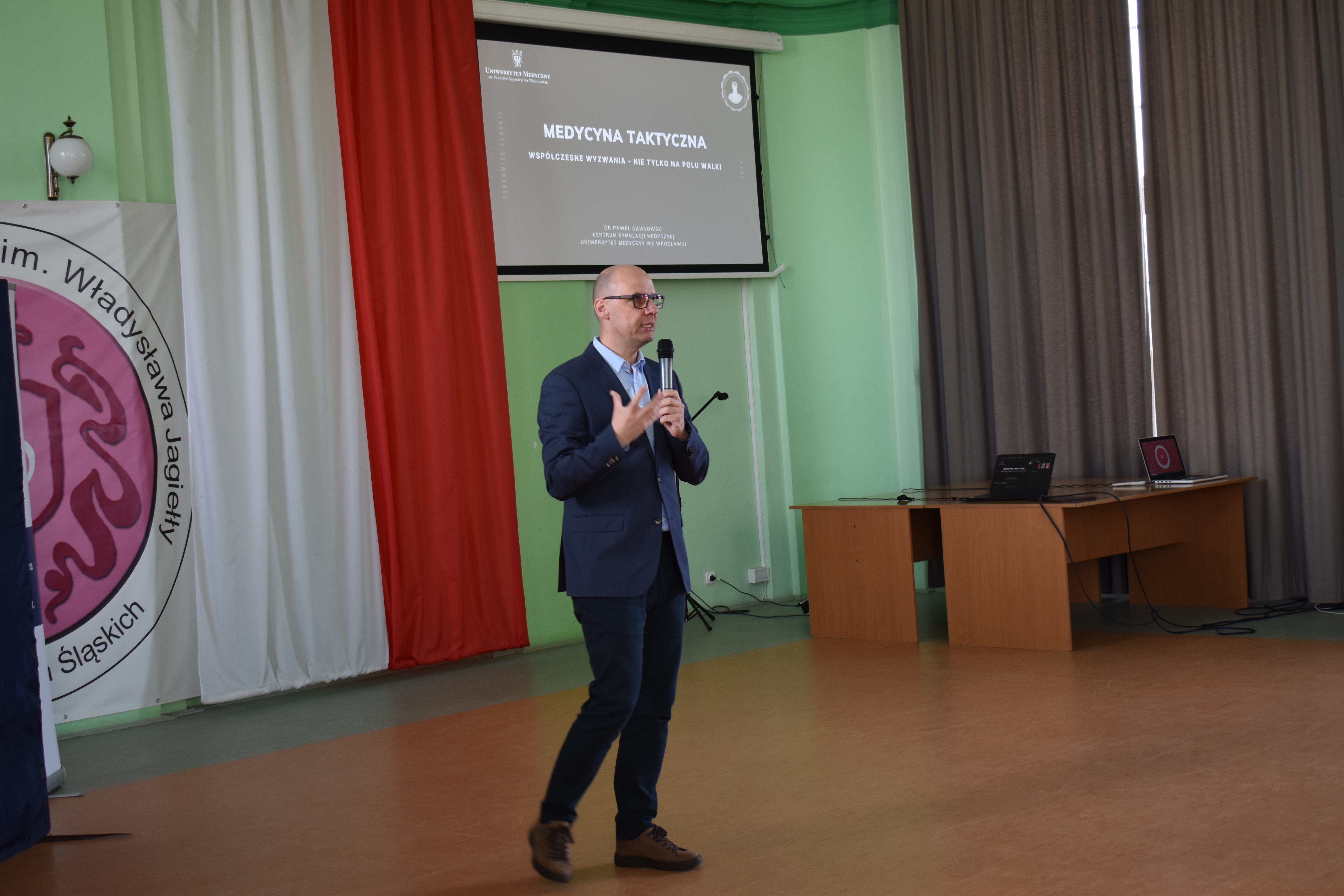 Dr Paweł Gawłowski, ratownik medyczny oraz adiunkt w centrum Symulacji Medycznej Uniwersytetu Medycznego we Wrocławiu przedstawił wykład pt. „Medycyna taktyczna - współczesne wyzwania nie tylko na polu walki.” W sposób arcyciekawy omówił zarówno przewidywane, jak i oczekiwane zachowania osób będącego świadkami wypadków lub zamachów terrorystycznych. Opowiedział w jaki sposób możemy pomóc sobie lub innym, gdy mamy do czynienia z krwotokiem, jak zabezpieczyć osobę nieprzytomną.