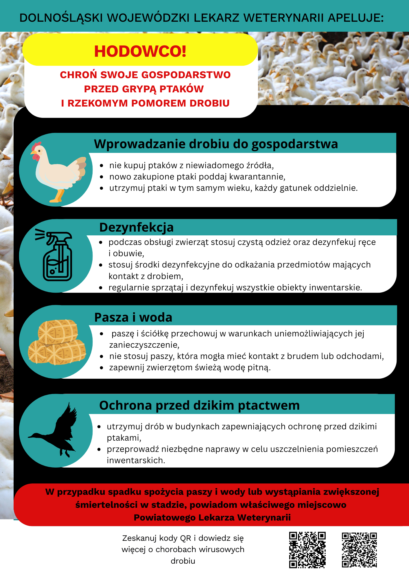 - Niezwłocznie zgłaszać Powiatowemu Lekarzowi Weterynarii wszelkie niepokojące objawy u drobiu, w tym nagłe upadki ptaków lub zmianę ich zachowania.
