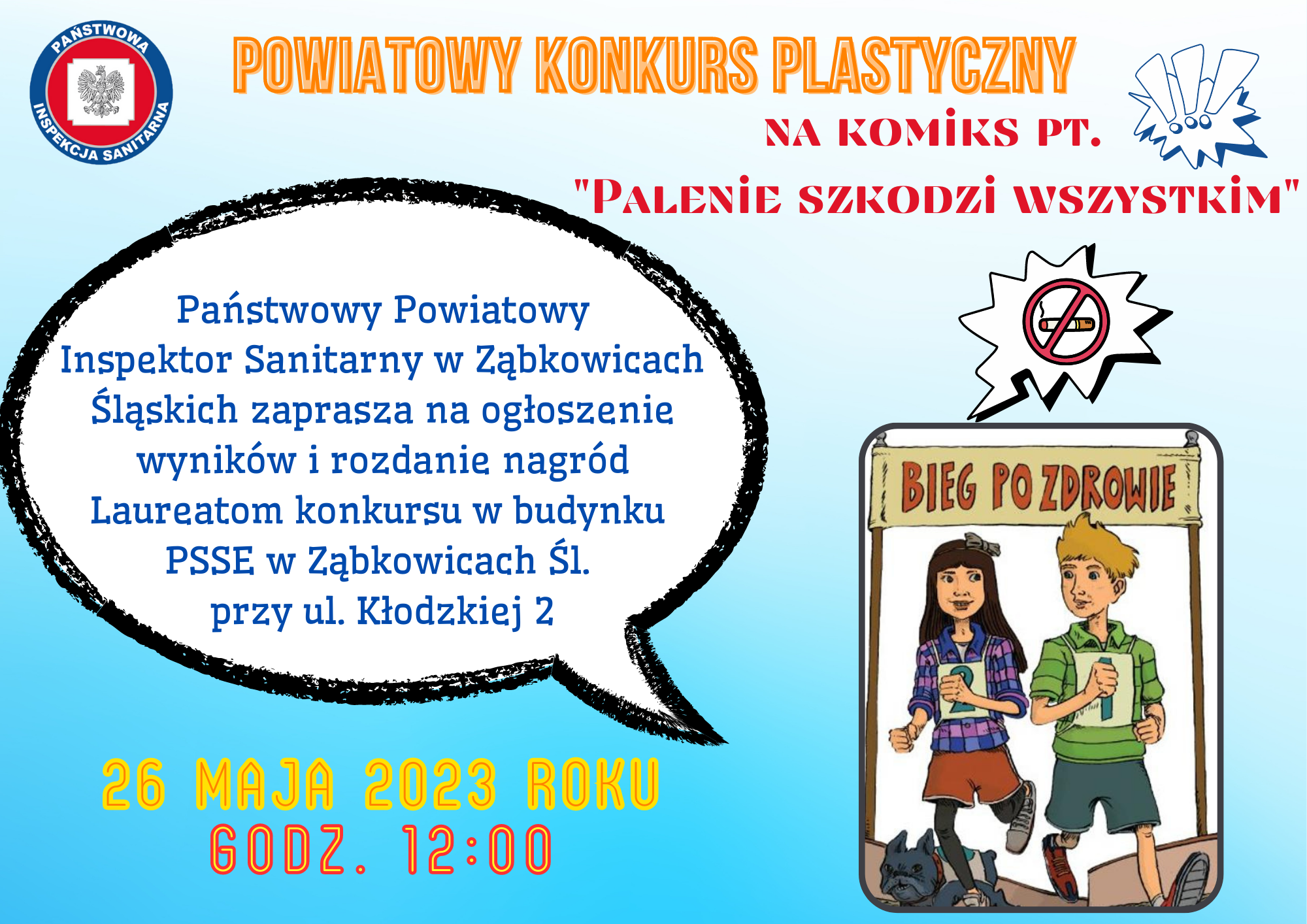 Państwowy Powiatowy Inspektor Sanitarny w Ząbkowicach Śl. informuje o organizowaniu VI edycji Powiatowego Konkursu Plastycznego na komiks pn. „Palenie szkodzi wszystkim”, który realizowany jest w ramach programu edukacyjnego „Bieg po zdrowie” i skierowany jest do uczniów klas IV szkół podstawowych powiatu ząbkowickiego.