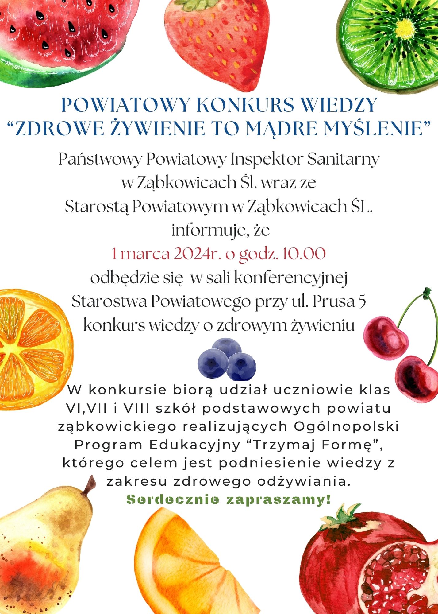 Państwowy Powiatowy Inspektor Sanitarny w Ząbkowicach Śl. informuje, że wraz ze Starostą Powiatu Ząbkowickiego, organizuje Powiatowy Konkurs Wiedzy pod hasłem „Zdrowe żywienie to mądre myślenie” w ramach realizacji programu edukacyjnego „Trzymaj Formę”.