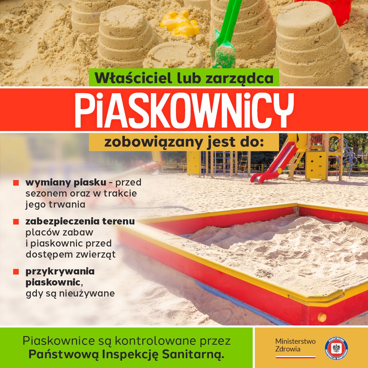 Jednocześnie konieczna jest wymiana piasku w piaskownicach co najmniej przed oraz w trakcie sezonu letniego, a także każdorazowo po stwierdzeniu w nim obecności widocznych zanieczyszczeń (odpadów, odchodów zwierzęcych i innych) stwarzających zagrożenie dla zdrowia ludzi, szczególnie dzieci, z uwagi na ich słabo rozwinięty układ odpornościowy. Obowiązek wymiany piasku w piaskownicach wynika z potrzeby zminimalizowania zagrożenia chorobami pasożytniczymi, odzwierzęcymi, zakaźnymi.