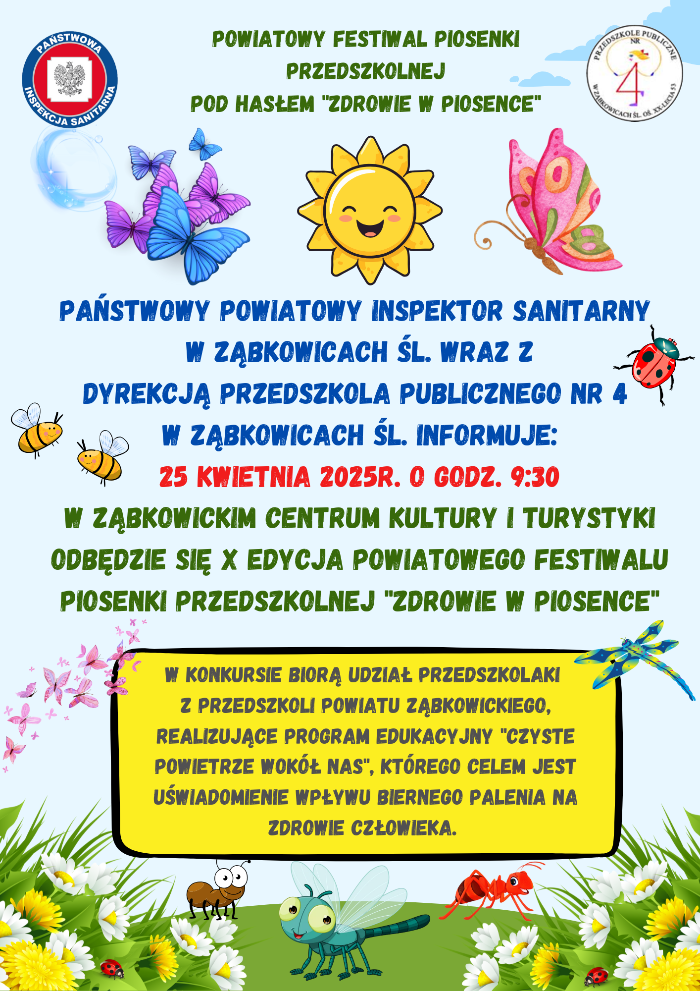 Państwowy Powiatowy Inspektor Sanitarny w Ząbkowicach Śl. informuje o kolejnej X edycji Powiatowego Festiwalu Piosenki Przedszkolnej pod hasłem „Zdrowie w Piosence”. Jest to wyjątkowe wydarzenie, które ma na celu promocję zdrowego stylu życia wśród najmłodszych, wykorzystując formę muzyczną – piosenki.