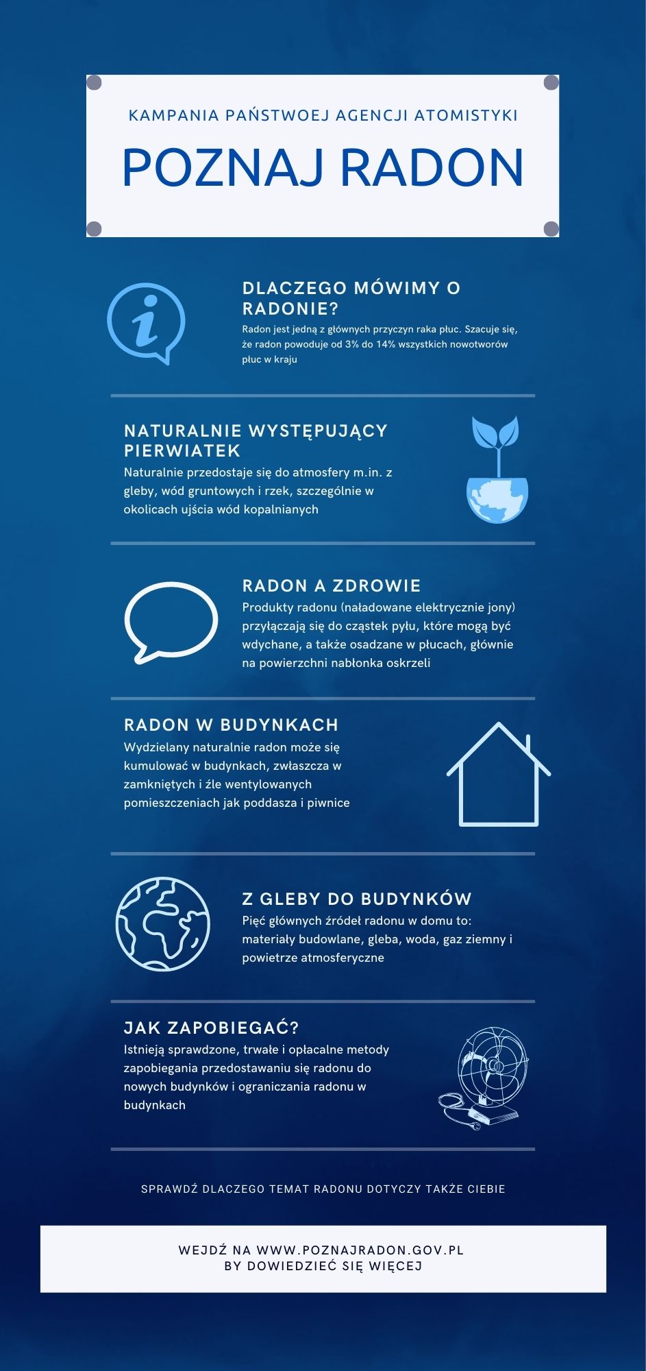 Państwowa Agencja Atomistyki prowadzi kampanię „Poznaj radon”. Na potrzeby działań informacyjnych uruchomiona została strona internetowa www.gov.pl/poznajradon. To kompendium wiedzy na temat radonu – na portalu PAA wyjaśnia czym jest radon, skąd pochodzi i jak się go mierzy. Platforma to także źródło informacji na temat historii odkrycia radonu. Zainteresowani znajdą tu ciekawostki, bazę wiedzy na temat radonu oraz odpowiedzi na najczęściej zadawane pytania. Celem kampanii jest przekazanie rzetelnej, aktualnej i specjalistycznej wiedzy o radonie, a tym samym zwiększenie świadomości Polaków na ten temat. Zapraszamy do regularnych odwiedzin strony „Poznaj radon”.