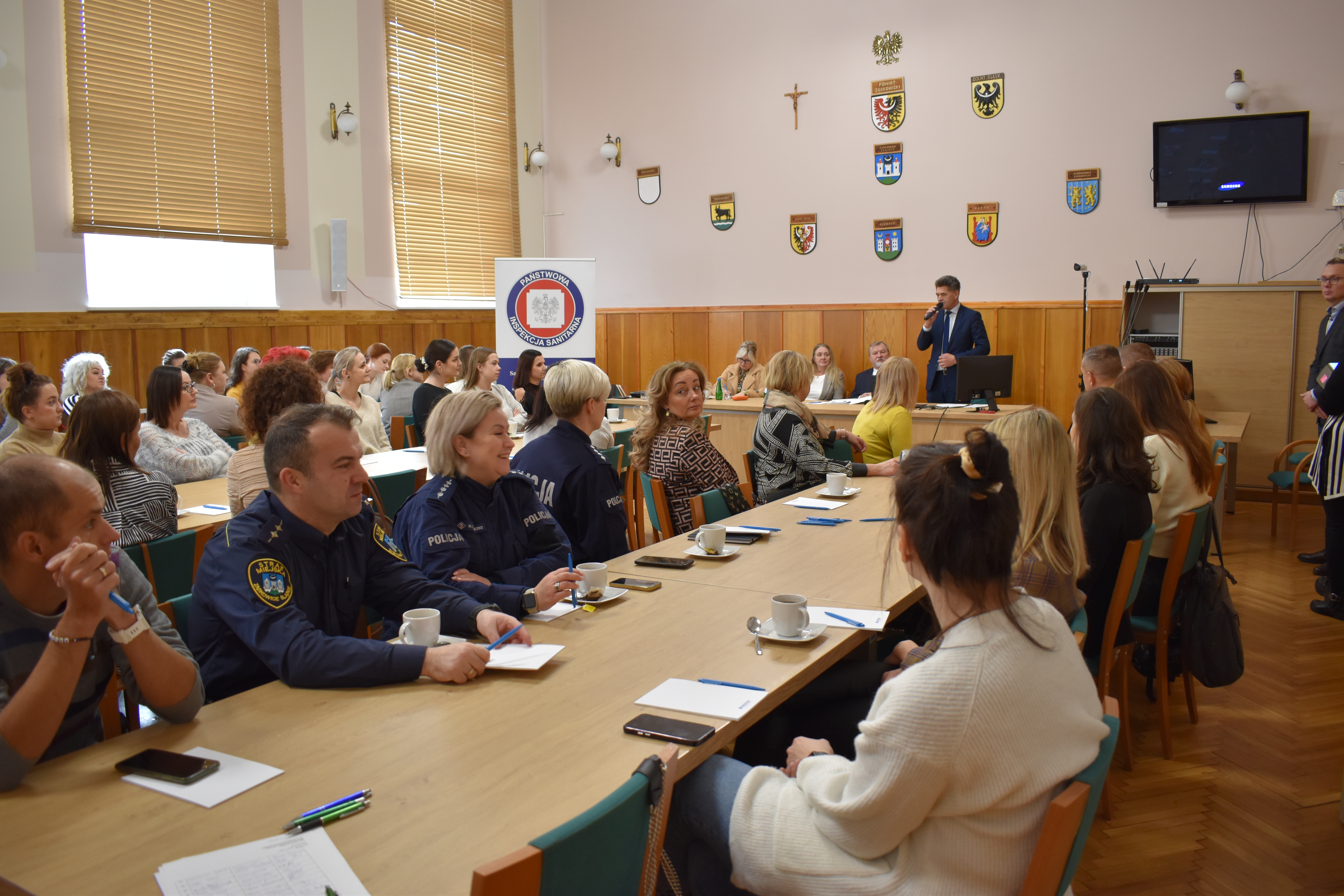 W ramach „Światowego Dnia AIDS” 30 listopada 2023 r. o godz. 10.00 w Starostwie Powiatowym w Ząbkowicach Śl. odbyło się szkolenie, którego celem było podniesienie poziomu wiedzy z zakresu profilaktyki HIV/AIDS i WZW, sposobów postępowania w sytuacji zagrożenia zakażenia się wirusem HIV, HBV i HCV wynikający ze specyfiki wykonywanego zawodu. W szkoleniu wzięły udział osoby świadczące usługi fryzjerskie, kosmetyczne i tatuażu oraz przedstawiciele straży miejskiej, policji i koordynatorzy programów edukacyjnych szkół ponadpodstawowych.