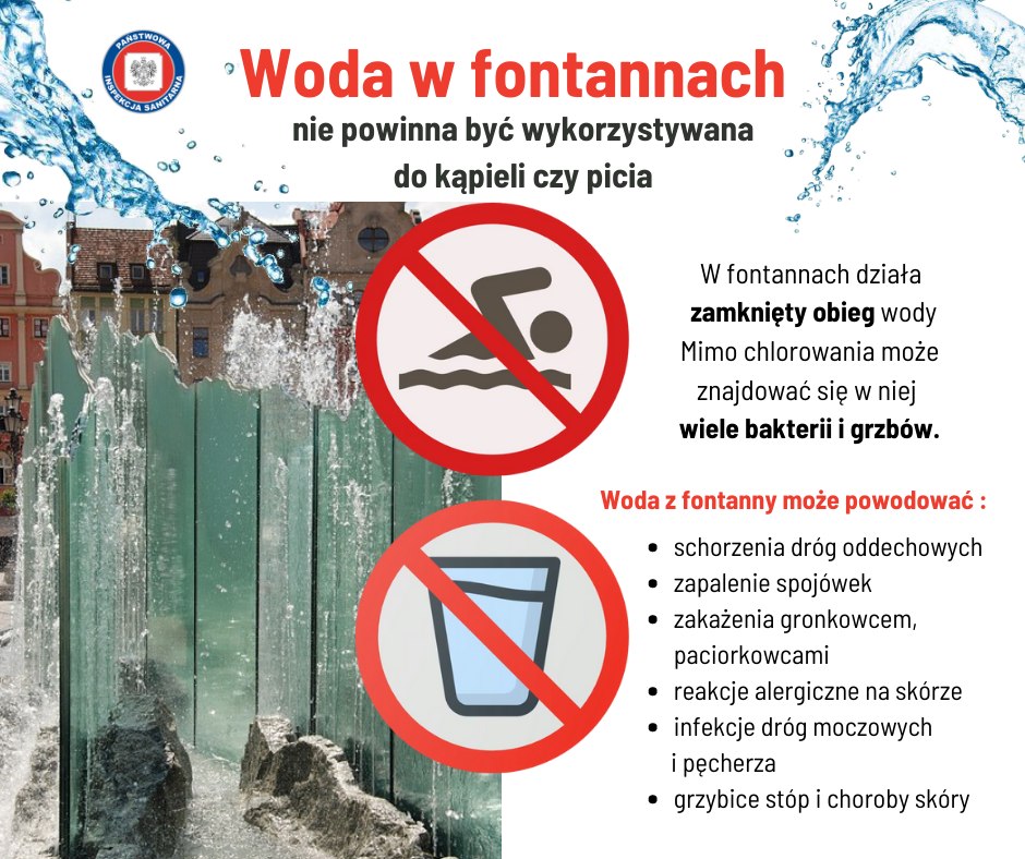 Woda w fontannach płynie w obiegu zamkniętym, nie podlega nadzorowi organów Inspekcji Sanitarnej, nie nadaje się do picia i kąpieli. Wysokie temperatury oraz czas wakacji może wpływać na chęć korzystania z wody w fontannach, zwłaszcza przez dzieci i młodzież. Woda w fontannach zwykle charakteryzuje się względną przeźroczystością, w związku z czym mylnie i bezzasadnie uważana jest za wodę czystą, co sprzyja nieprawidłowemu wykorzystywaniu tej architektury miejskiej.