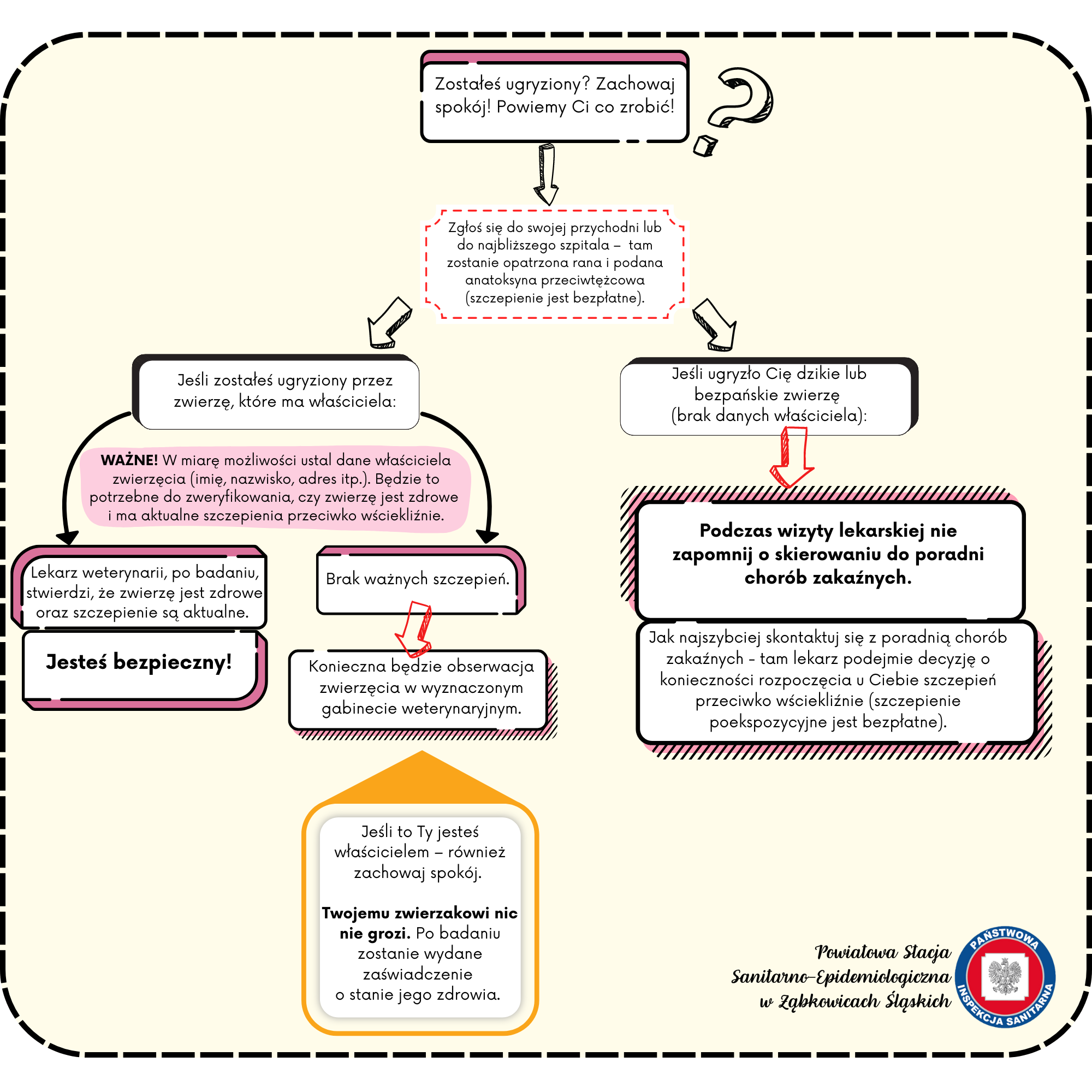 Okres wakacyjny i piękna pogoda sprawiają, że spędzamy na świeżym powietrzu sporo wolnego czasu. Niestety w okresie letnim obserwujemy wzrost liczby zgłoszeń dotyczących pogryzień, w związku z tym, Państwowy Powiatowy Inspektor Sanitarny w Ząbkowicach Śląskich przedstawia krótki schemat postępowania w przypadku pogryzienia.