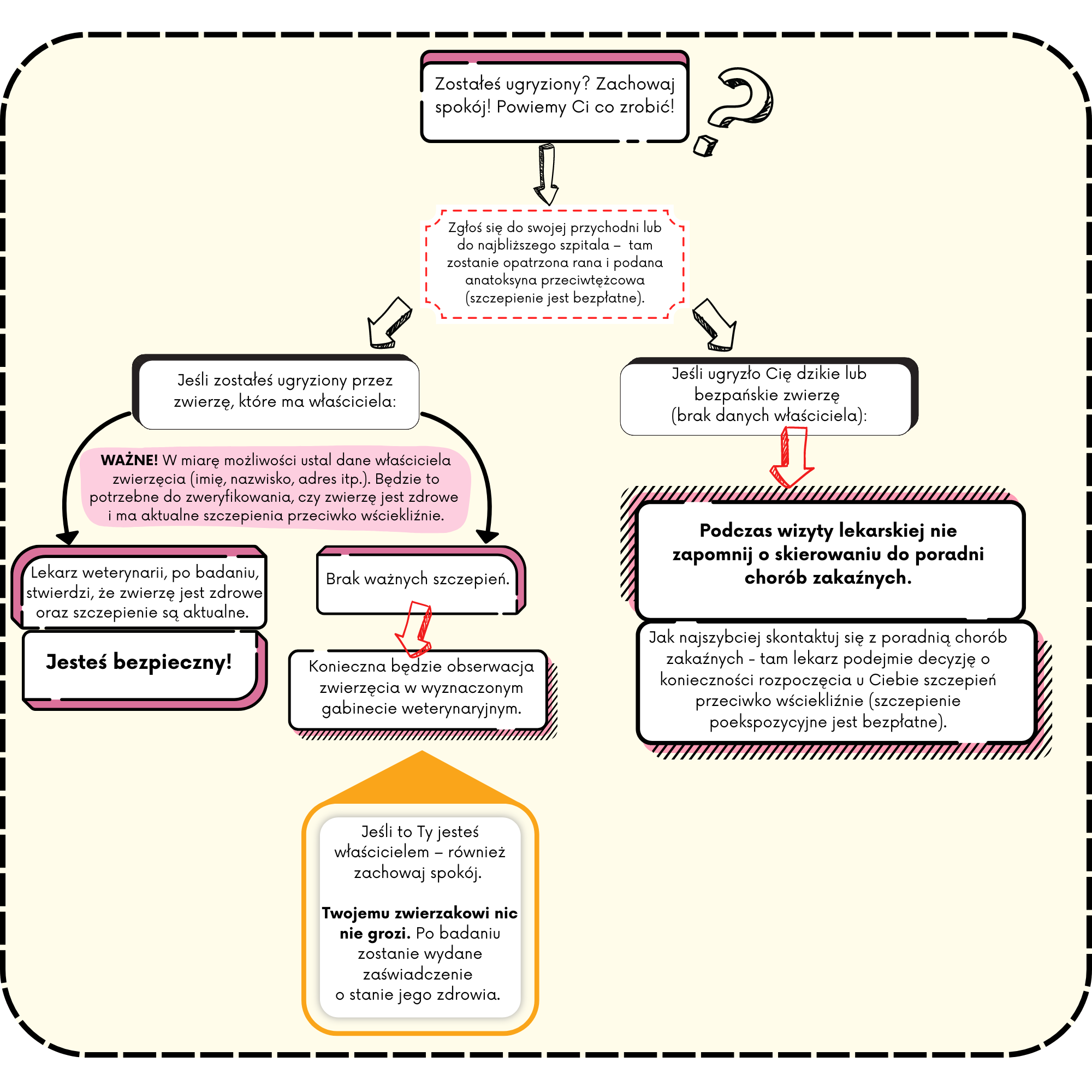 Zostałeś ugryziony przez zwierzę domowe lub dzikie? Zachowaj spokój. Powiemy Ci co zrobić! Zapoznaj się ze schematem postępowania.