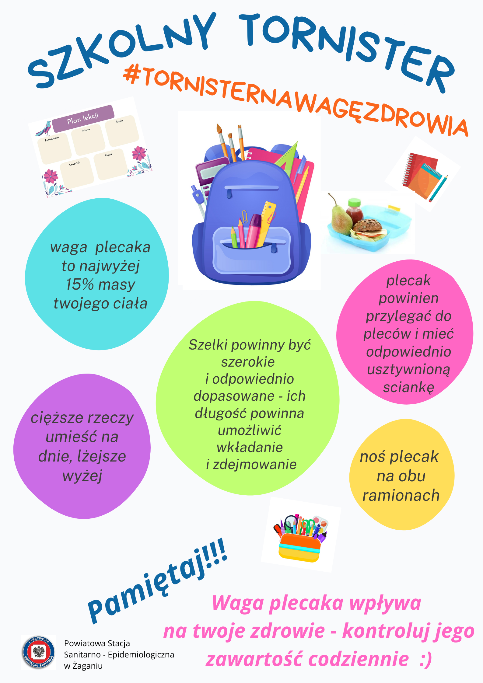 Jako instytucja dbająca o zdrowie naszego społeczeństwa chcemy utrwalać wśród najmłodszych uczniów i ich opiekunów zasady, którymi powinni kierować się przy pakowaniu tornistra. Nieodpowiednie nawyki związane z noszeniem zbyt dużego obciążenia na plecach oraz utrzymywaniem nieprawidłowej postawy ciała, mogą przyczynić się do bólów kręgosłupa, zmniejszenia pojemności płuc, a w efekcie doprowadzić do poważnych schorzeń ortopedycznych i neurologicznych.