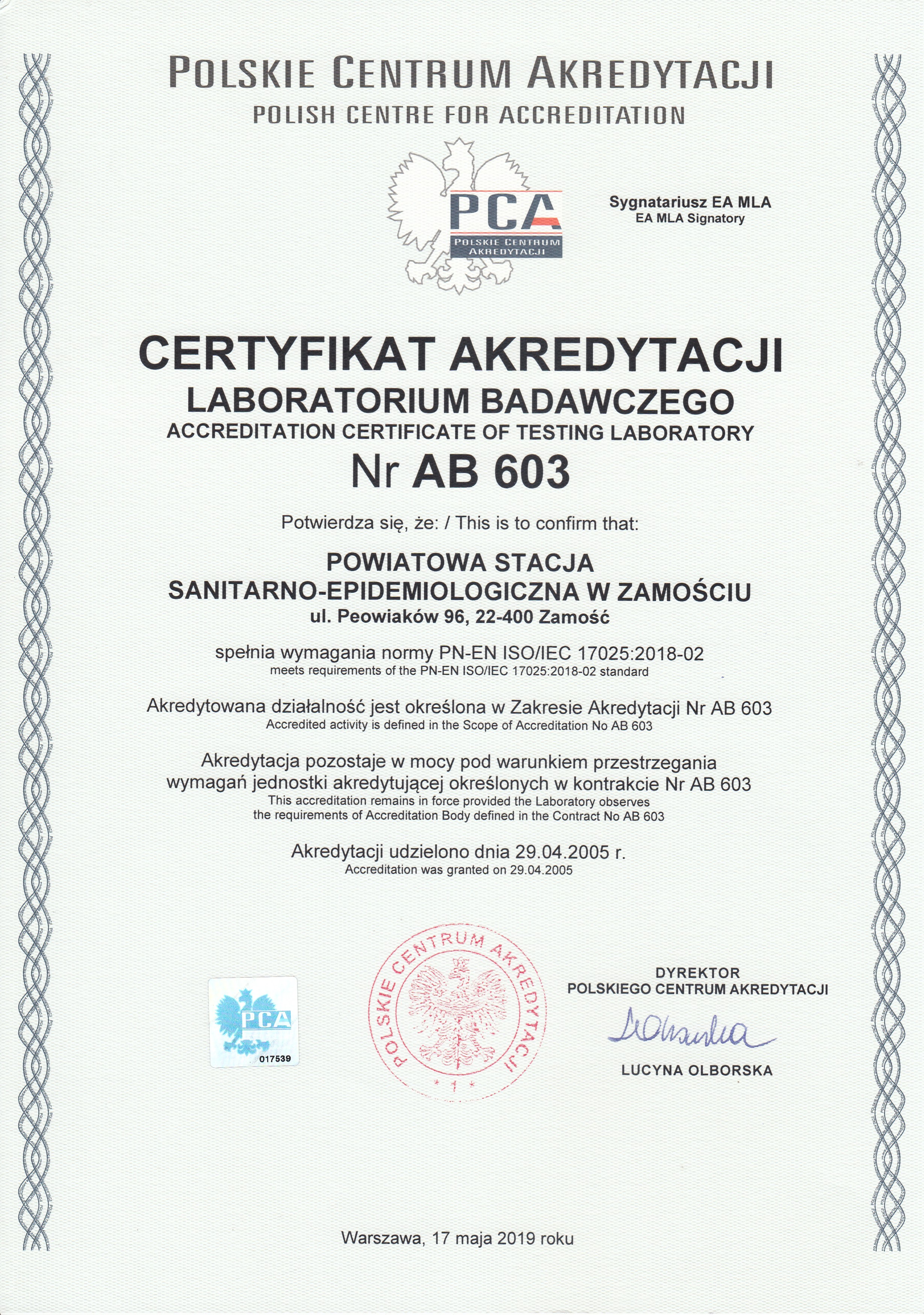 Badania akredytowane Akredytacja: AB 603 Polskie Cebtrum Akredytacji - strona podmiotu Materiały Certyfikat akredytacji PSSE Zamość AB_603__-_2019.jpg 2.14MB