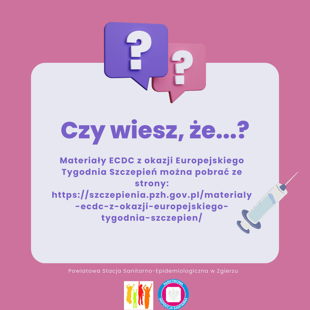 Materiały z okazji Europejskiego Tygodnia Szczepień można pobrać ze strony: https://szczepienia.pzh.gov.pl/materialy-ecdc-z-okazji-europejskiego-tygodnia-szczepien/