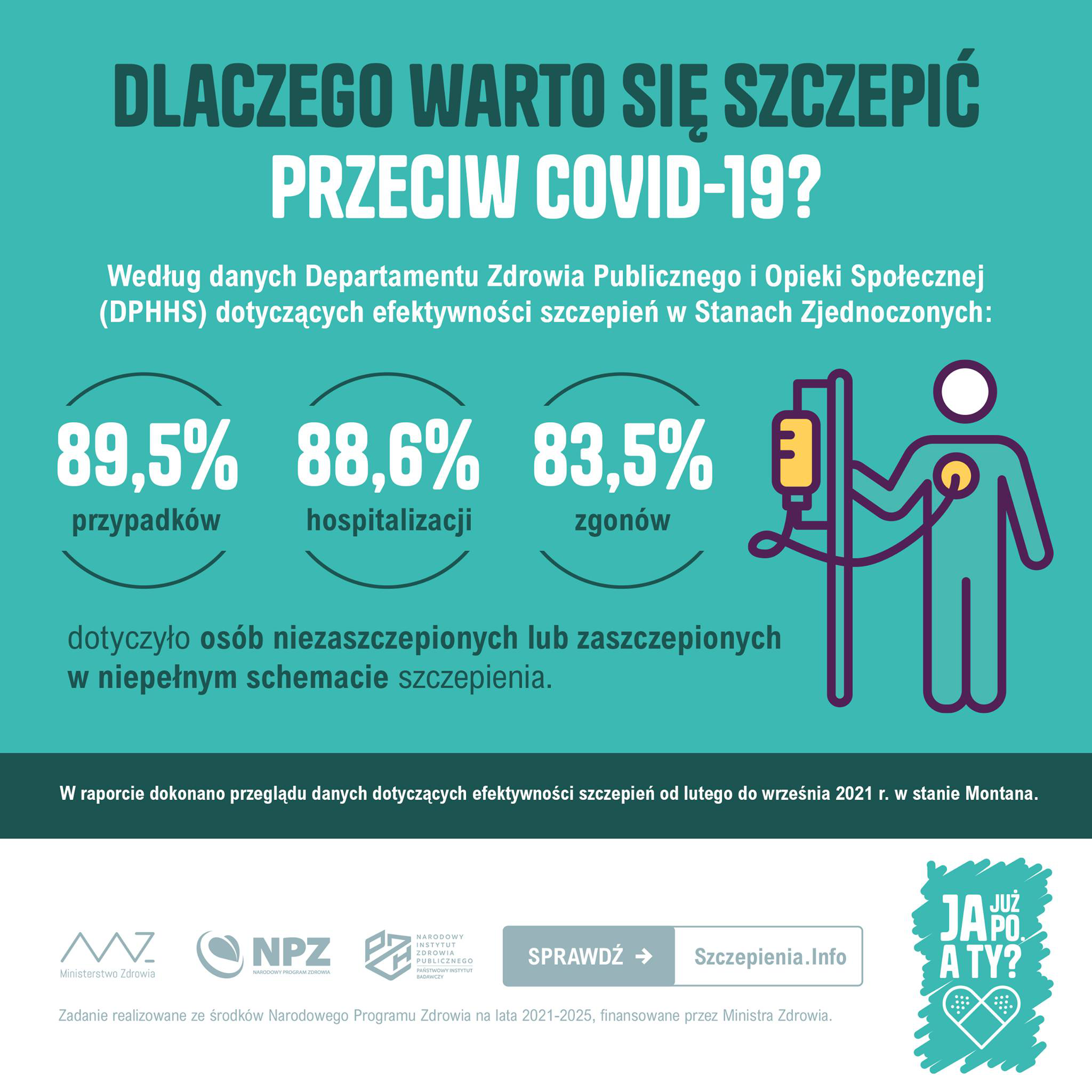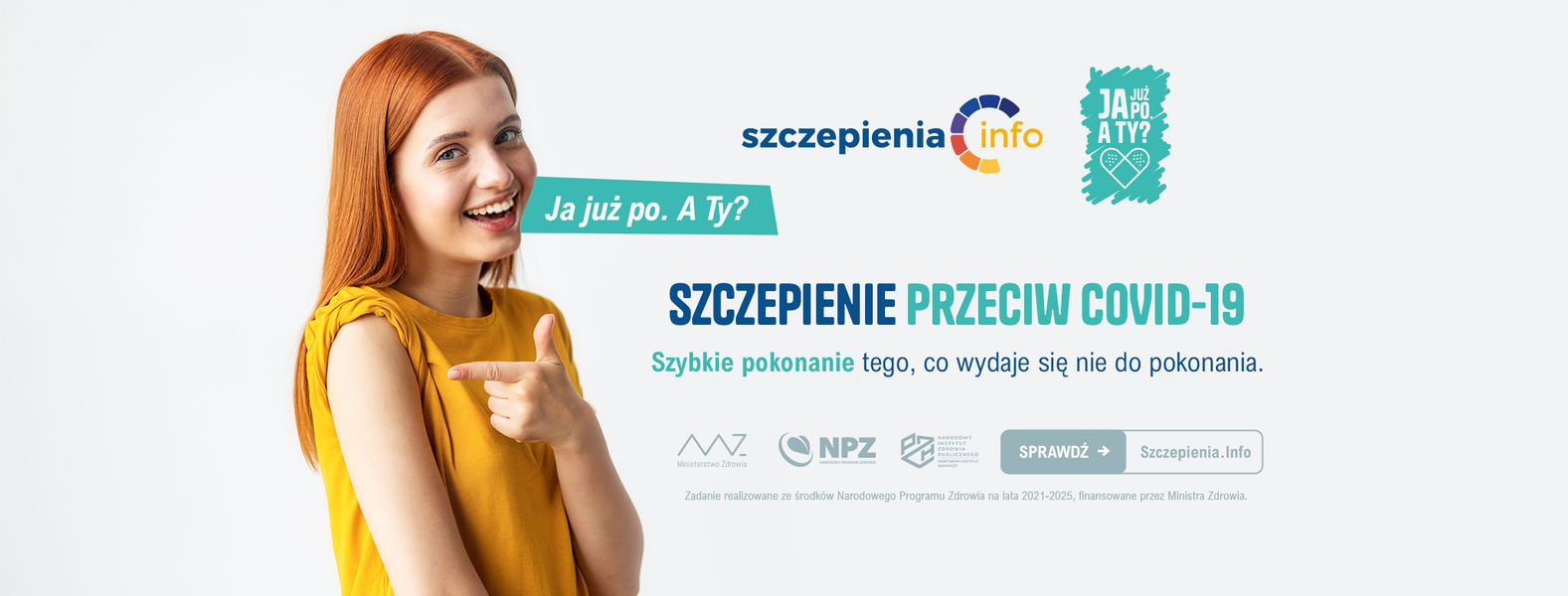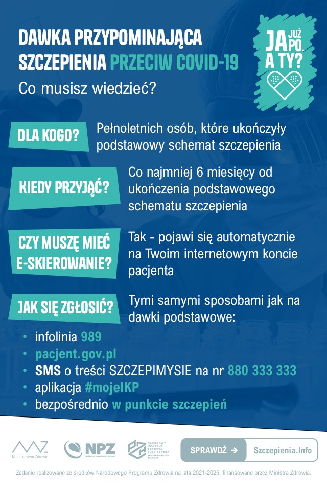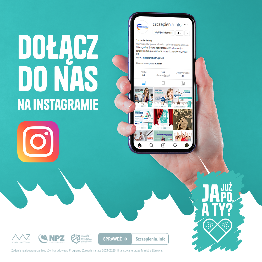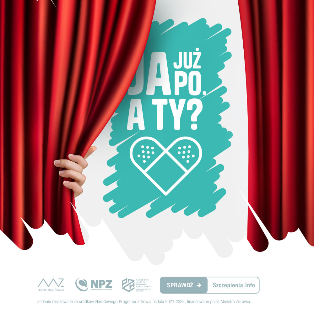 9 listopada rozpoczęła się ogólnopolska kampania społeczna „Ja już po. A Ty?”, która realizowana jest w ramach prowadzonego przez Narodowy Instytut Zdrowia Publicznego PZH - NIZP (PZH – PIB) projektu pt. „Promocja szczepień, utrzymanie funkcjonalności portalu informacyjnego dotyczącego szczepień – działania promocyjne i popularyzacyjne dotyczące szczepień ochronnych” w ramach Narodowego Programu Zdrowia na lata 2021-2025.