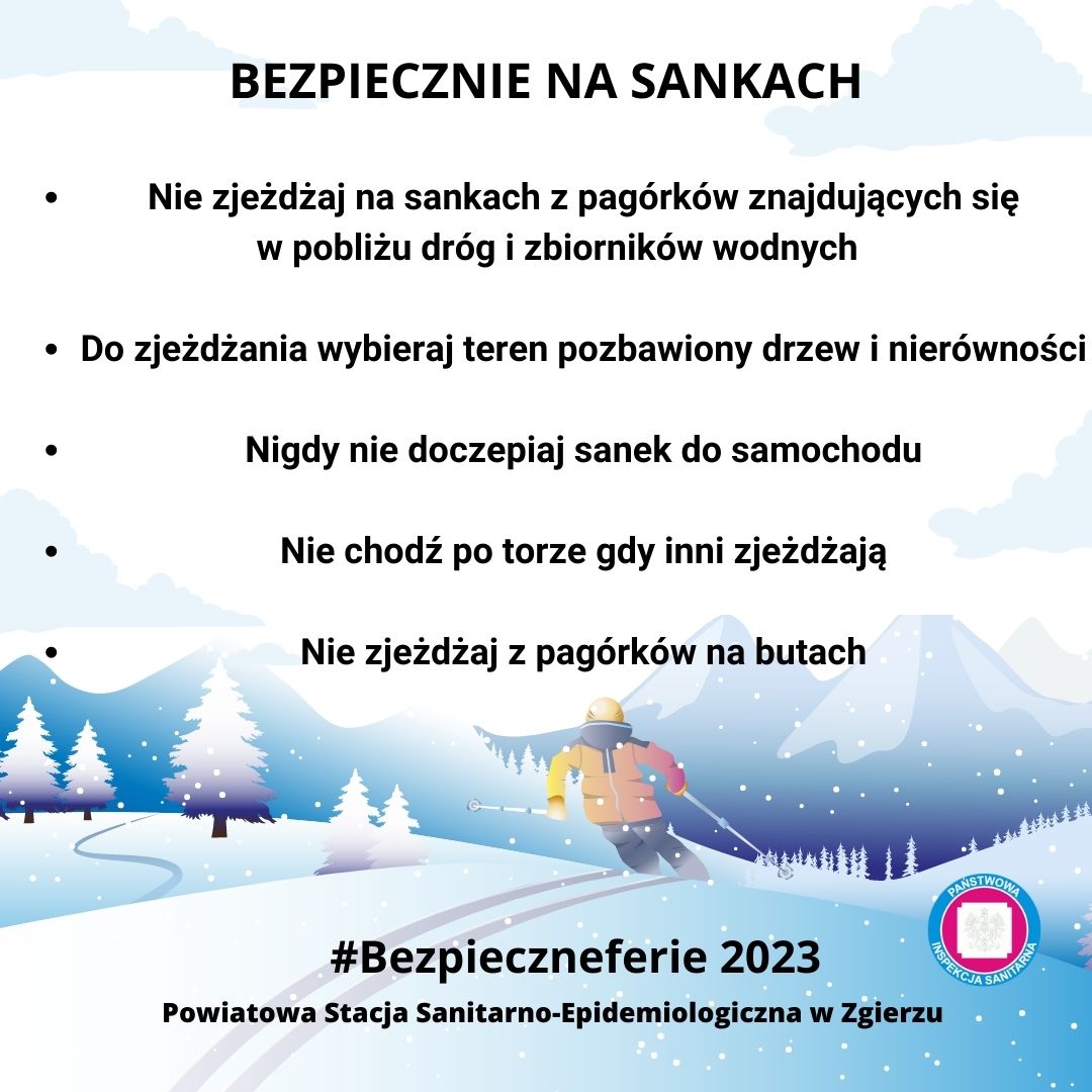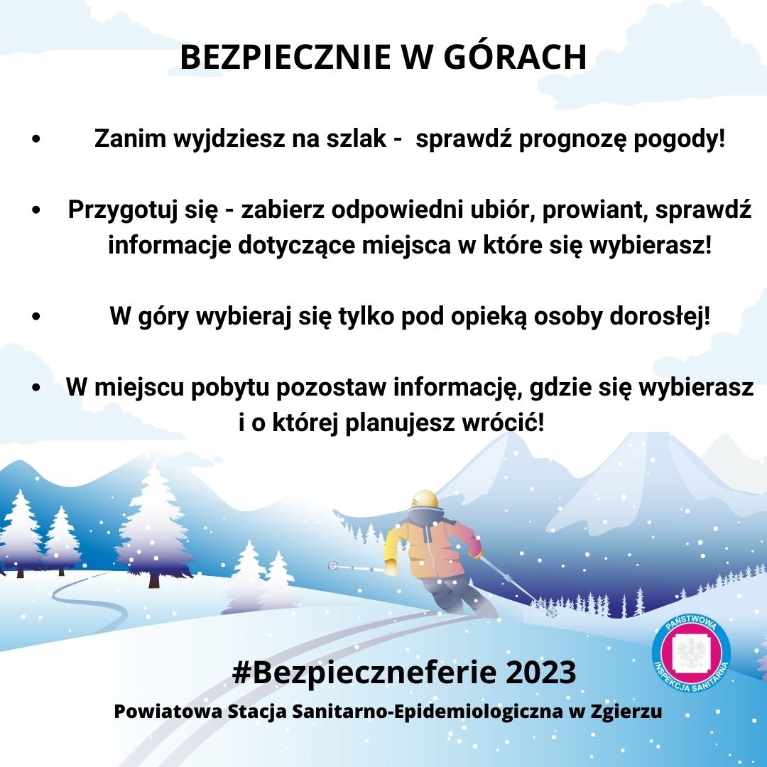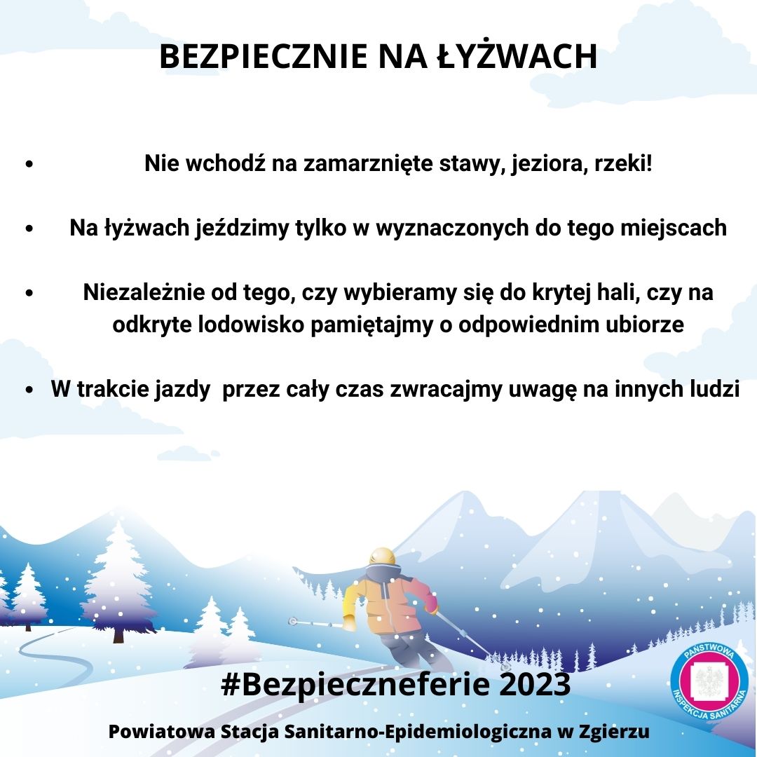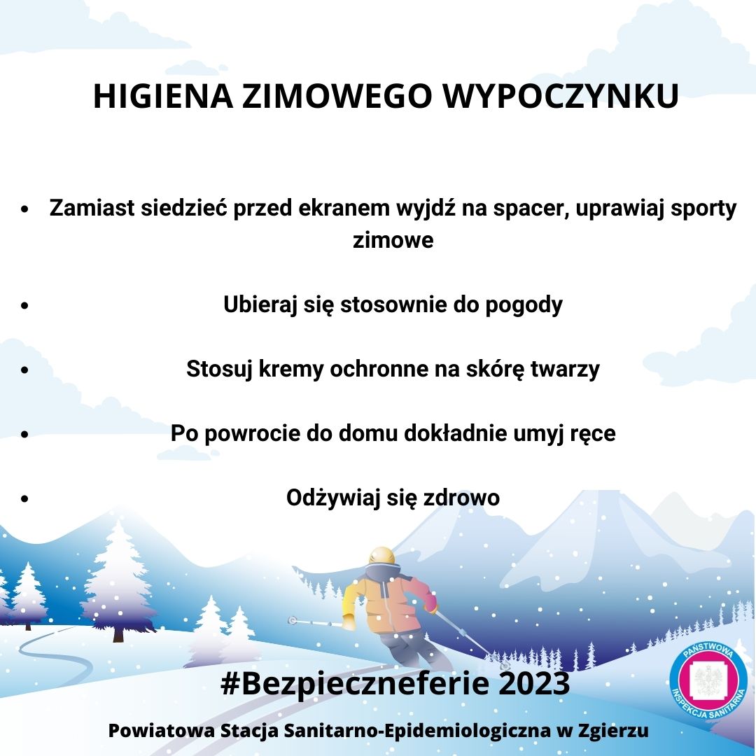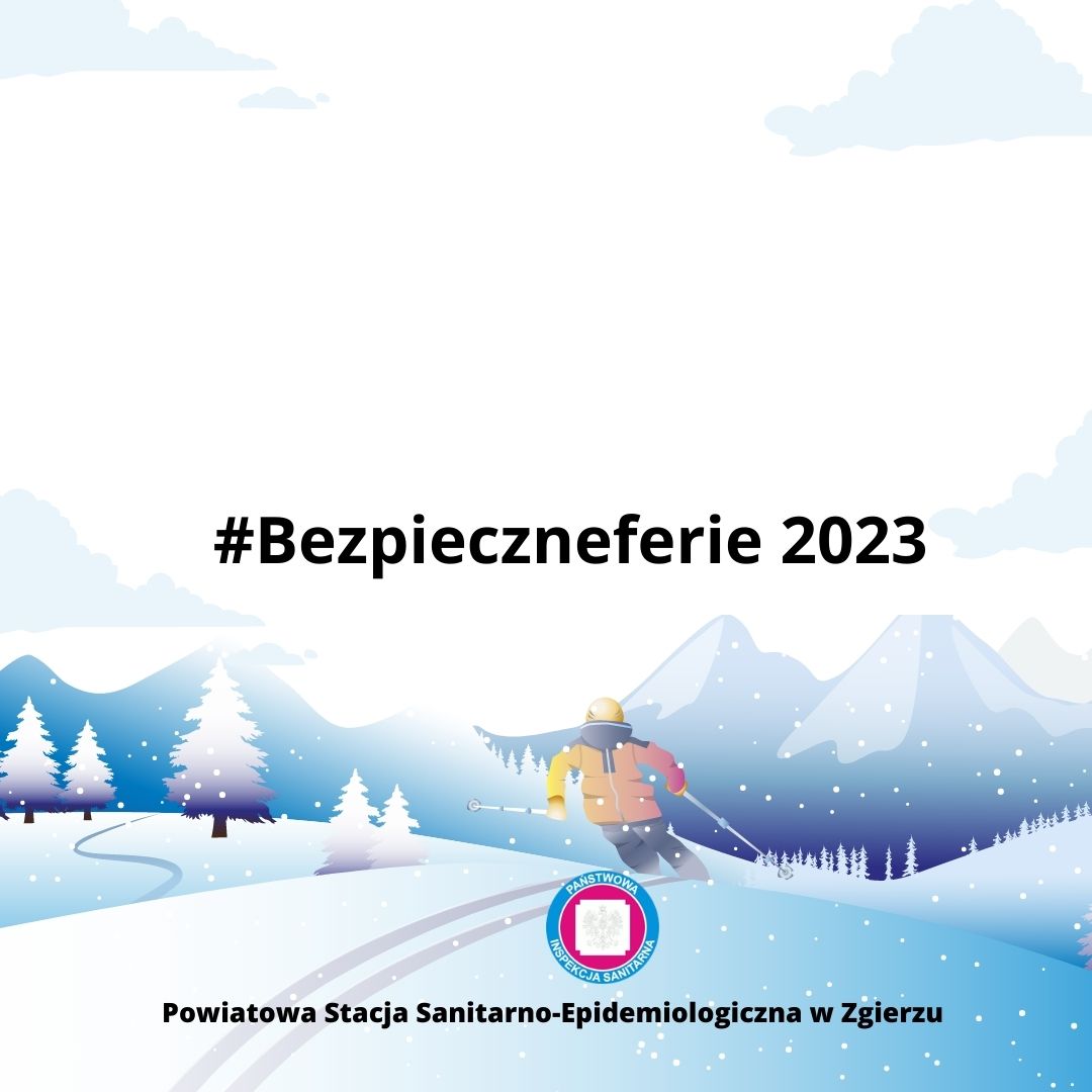 Zapraszamy Państwa do włączenia się w Kampanię informacyjną #Bezpieczneferie organizowaną przez Państwowego Powiatowego Inspektora Sanitarnego w Zgierzu, poprzez udostępnianie w mediach społecznościowych grafik informacyjnych ( do pobrania poniżej).