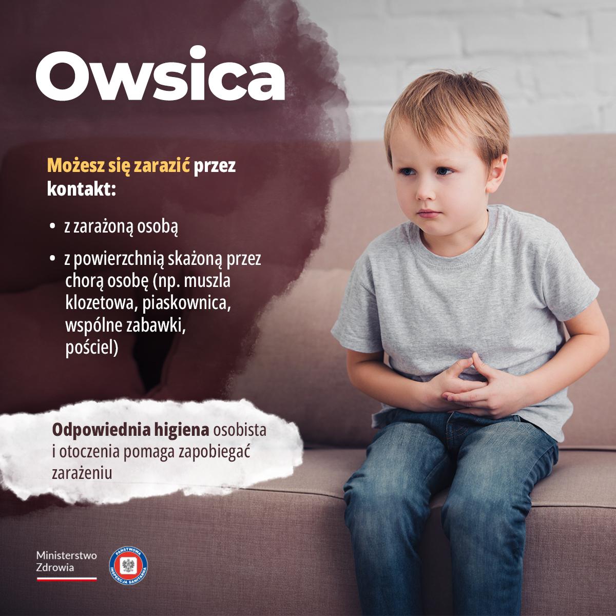 Owsica daje typowe objawy: świąd, więc i drapanie okolicy odbytu, bardziej nasilone w nocy. Może się to wiązać z bezsennością, a przez to rozdrażnieniem (z niewyspania) w dzień. Dodatkowo drapanie sprzyja zakażeniu skóry w tej okolicy (zaczerwienienie, ból, treść ropna), co łatwo zauważyć.