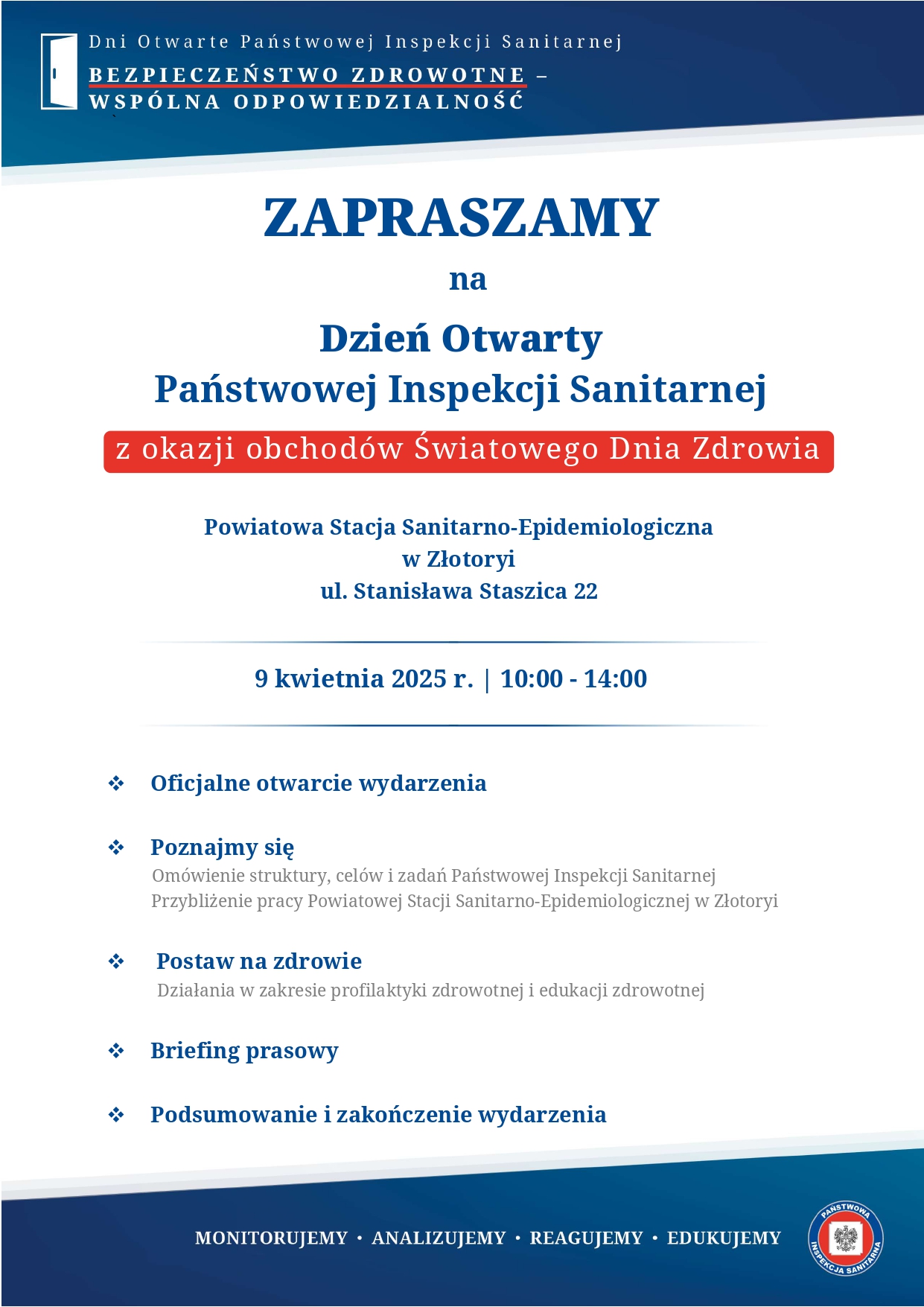 Powiatowa Stacja Sanitarno-Epidemiologiczna w Złotoryi serdecznie zaprasza na Dni Otwarte Państwowej Inspekcji Sanitarnej pod hasłem „Bezpieczeństwo zdrowotne- wspólna odpowiedzialność”, które odbędą się w dniu 9 kwietnia 2025 r. w siedzibie naszej stacji przy ulicy Stanisława Staszica 22 w Złotoryi.