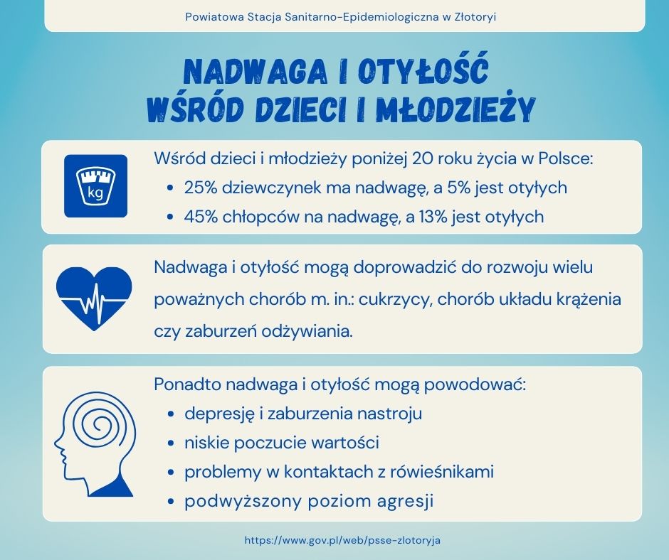 Zgodnie z wynikami badania PITNUTS (2016 r.) ok. 10% dzieci w wieku 1-3 lat ma nadwagę/otyłość, a dodatkowe 18,4% jest zagrożone nadmierną masą ciała. Problem nadwagi i otyłości dotyczy też niemal co trzeciego 8-latka (badanie COSI, 2016). U starszych dzieci i młodzieży nie jest znacząco lepiej. Według danych uzyskanych z ogólnopolskiego badania przeprowadzonego przez Instytut Żywności i Żywienia wśród uczniów szkół podstawowych i gimnazjów (10-16 lat) problem nadmiernej masy ciała dotyczył co piątego ucznia, przy czym częściej występował u chłopców niż u dziewcząt. Stwierdzono też, że wraz z wiekiem problem ten nieco malał chociaż nadal utrzymywał się na poziomie ok. 22% u gimnazjalistów i ok. 16% u gimnazjalistek. Najbardziej na występowanie nadwagi i otyłości narażeni byli uczniowie z województwa mazowieckiego i łódzkiego, najmniej – z województwa śląskiego i świętokrzyskiego. Najnowsze (2018 r.) wstępne wyniki badania zachowań zdrowotnych młodzieży w wieku 11-15 lat (międzynarodowe badanie HBSC, w którym od wielu lat uczestniczy również Polska) wskazują, że nadmierna masa ciała występuje u 29,7% chłopców i 14,3% dziewcząt (wg kryteriów WHO, 2007). Odsetki te są wyższe o kilka procent w porównaniu do wyników edycji tego badania z 2014 r. W latach 2014-2018 odsetek młodzieży z nadmierną masą ciała wzrósł z 19,9% do 21,7% przy czym silniejsze pogorszenie zaobserwowano u chłopców w porównaniu do dziewcząt, a biorąc pod uwagę wiek – u 13-latków obojga płci. Nie ma wątpliwości, że nadwaga i otyłość to problem dużej wagi. Przedstawione dane wskazują, że nadal istnieje ogromna potrzeba poszukiwania i realizacji skutecznych na globalną skalę działań, które pozwolą wyhamować niekorzystne trendy związane z problemem nadwagi i otyłości wśród dzieci i młodzieży.