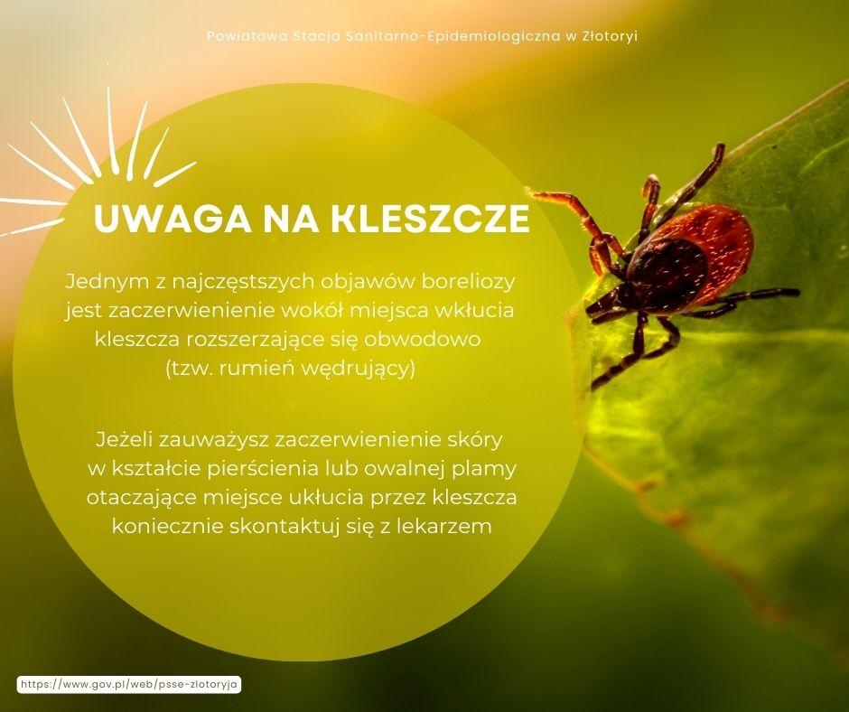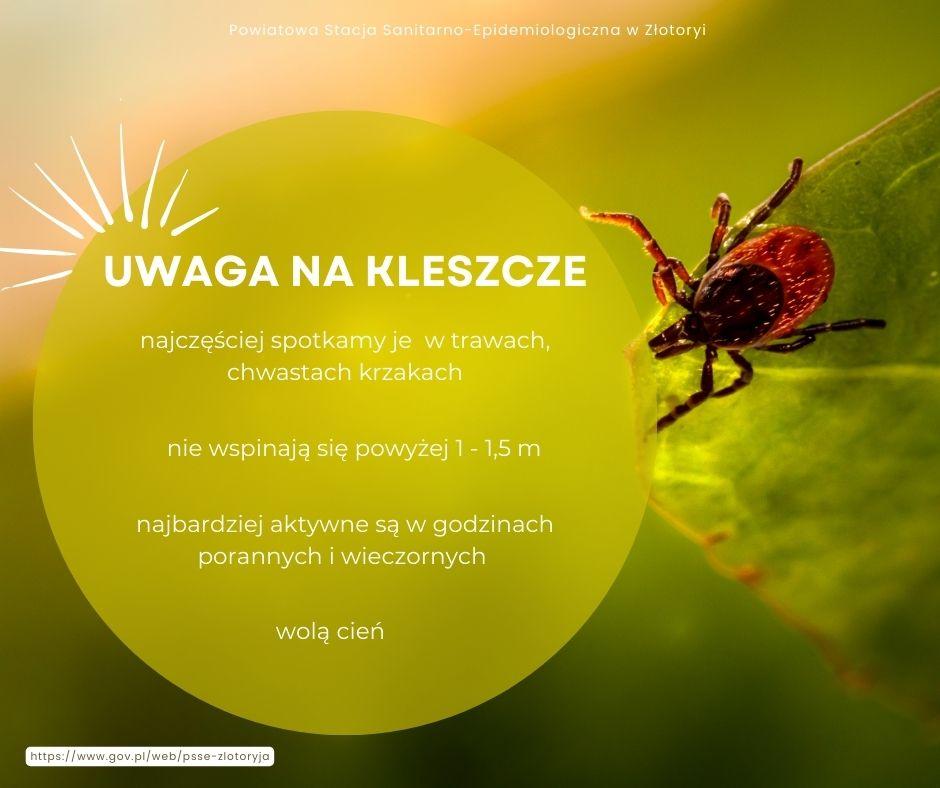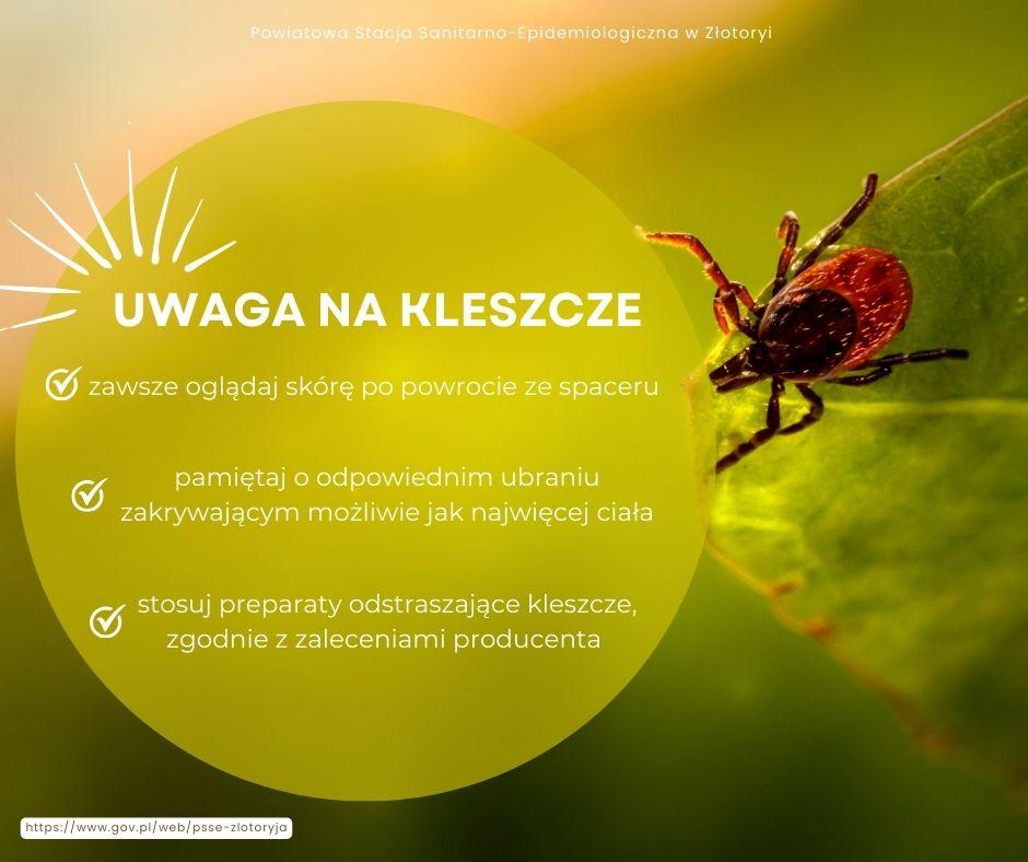 Wiosna i miesiące letnie sprzyjają częstszemu korzystania z form wypoczynku na świeżym powietrzu w parkach i lasach oraz noszeniu lżejszego ubioru, zwiększają równocześnie ryzyko pokąsania przez kleszcze mogące przenosić groźne dla zdrowia, bakterie, wirusy i pierwotniaki.