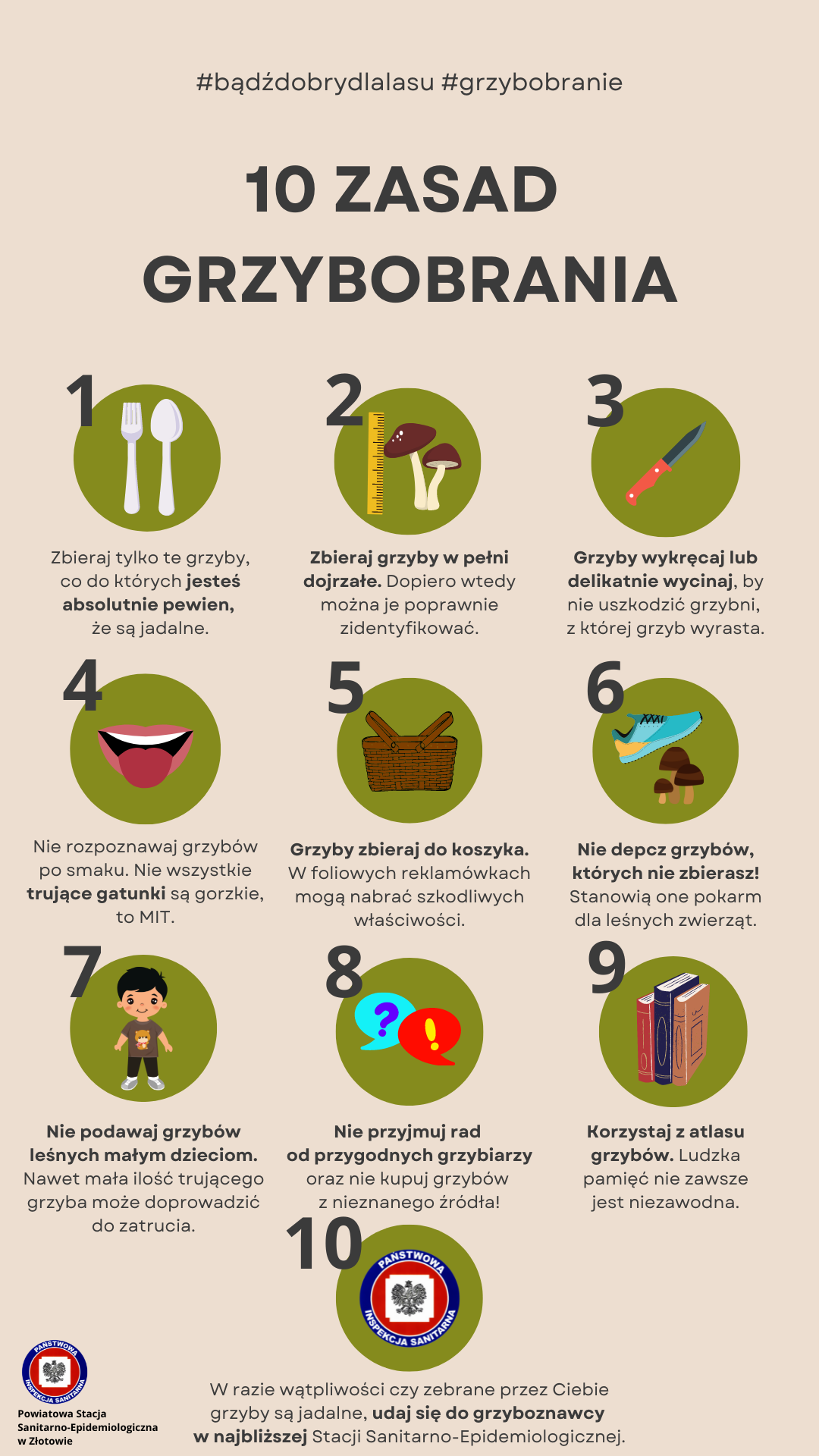 Zbieraj grzyby, co, do których masz całkowitą pewność. Jeżeli masz wątpliwości, nie ryzykuj, przynieś grzyby do najbliższej siedziby stacji sanitarno-epidemiologicznej, w której dyżury pełnią grzyboznawcy lub klasyfikatorzy grzybów. Specjalista bezpłatnie oceni czy grzyby są jadalne, niejadalne czy też trujące.