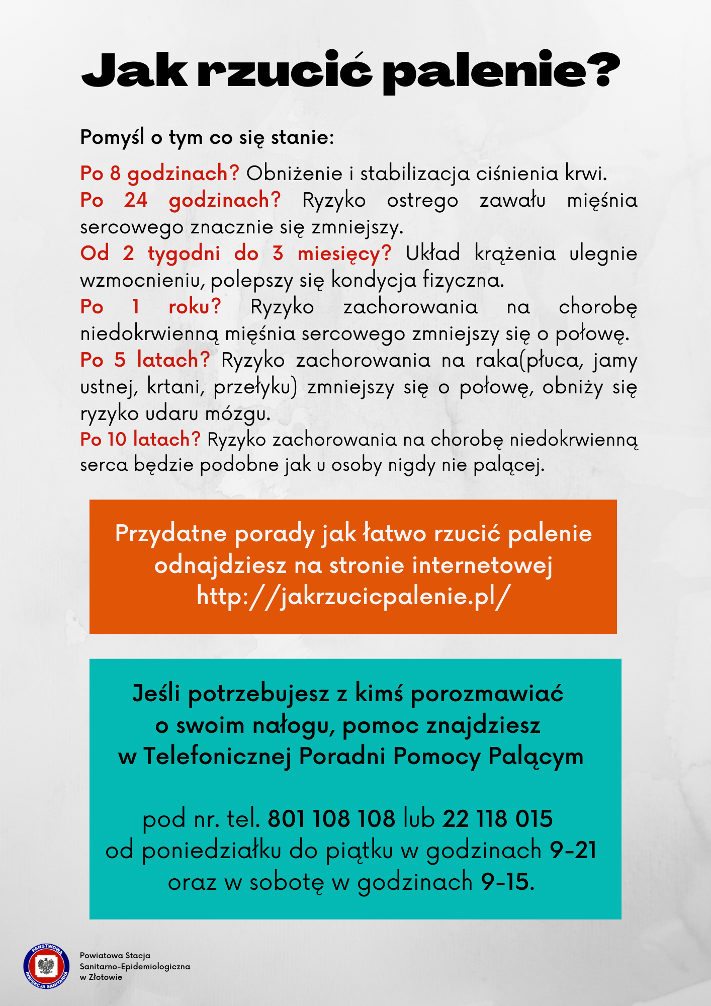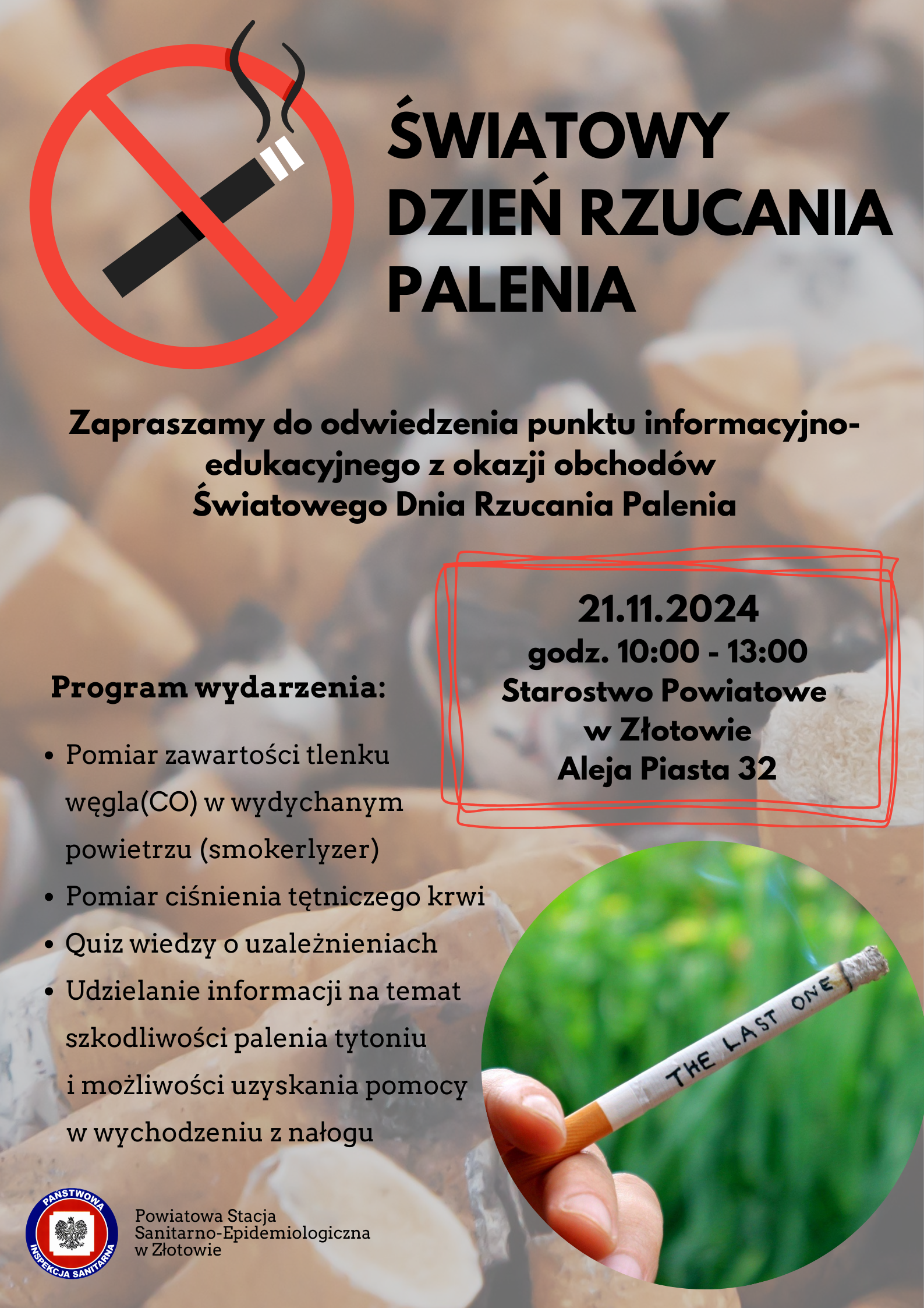 W ramach Światowego Dnia Rzucania Palenia 21 listopada w holu Starostwa Powiatowego w Złotowie organizujmy punkt informacyjno-edukacyjny, na który serdecznie zapraszamy.