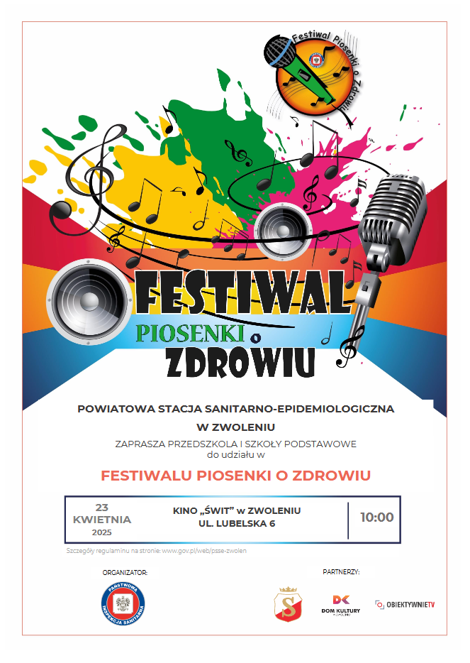 Państwowy Powiatowy Inspektor Sanitarny w Zwoleniu serdecznie zaprasza na Festiwal Piosenki o Zdrowiu, który odbędzie się 23 kwietnia 2025 roku. Wydarzenie organizowane w naszym powiecie po raz drugi cieszy się ogromnym zainteresowaniem wśród dzieci. Organizatorem Festiwalu jest Powiatowa Stacja Sanitarno-Epidemiologiczna w Zwoleniu, a partnerem Urząd Miejski w Zwoleniu i Dom Kultury w Zwoleniu.