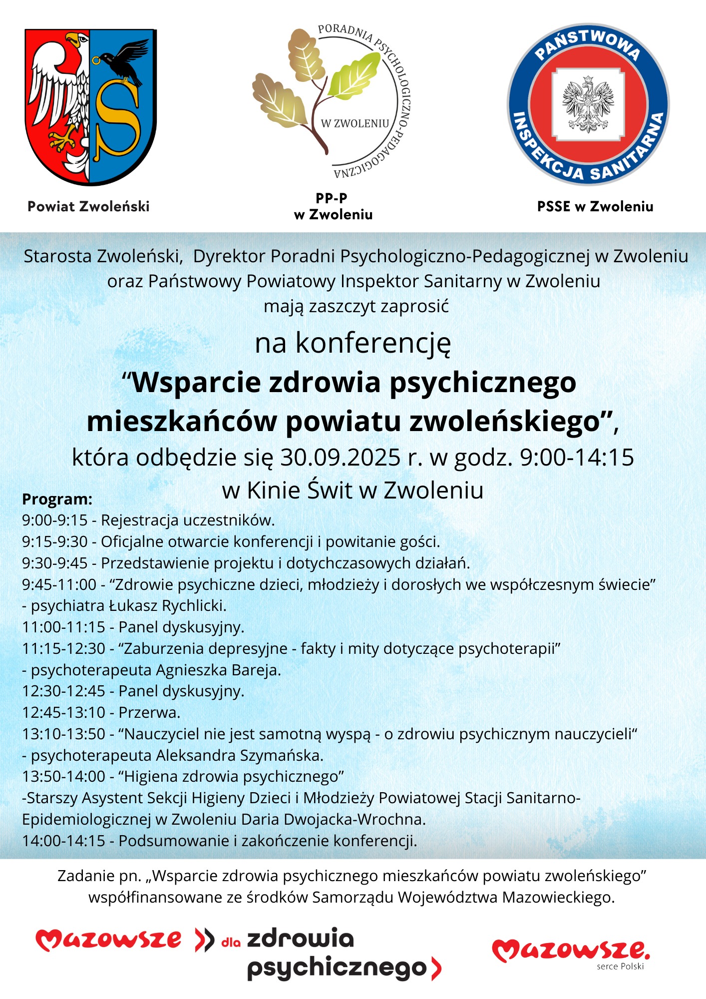 Serdecznie zapraszamy na Konferencję pn. "Wsparcie zdrowia psychicznego mieszkańców powiatu zwoleńskiego".