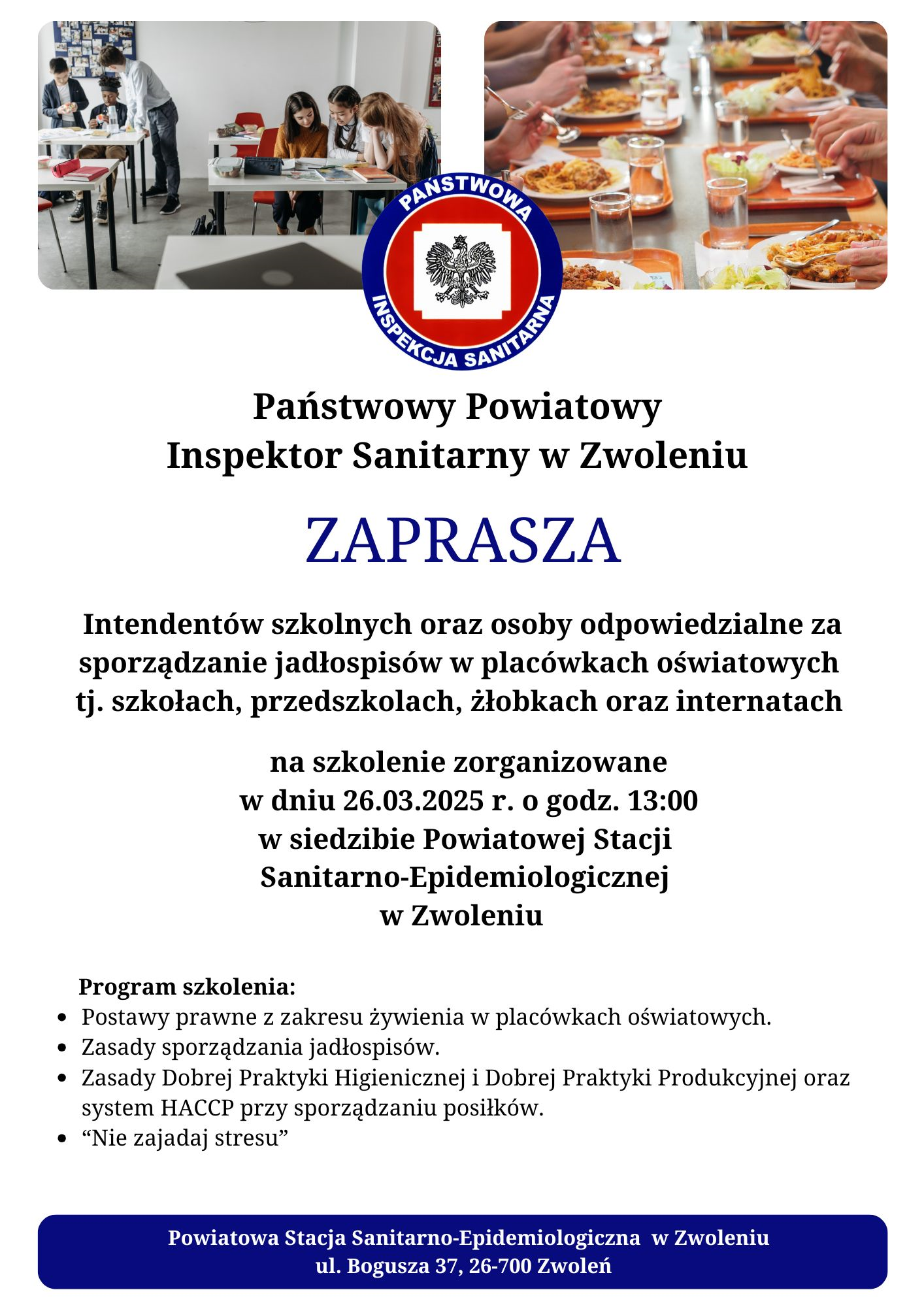 Państwowy Powiatowy Inspektor Sanitarny w Zwoleniu zaprasza Intendentów szkolnych oraz osoby odpowiedzialne za sporządzanie jadłospisów w placówkach oświatowych tj. szkołach, przedszkolach, żłobkach i internatach na szkolenie z zakresu żywienia dzieci i młodzieży .