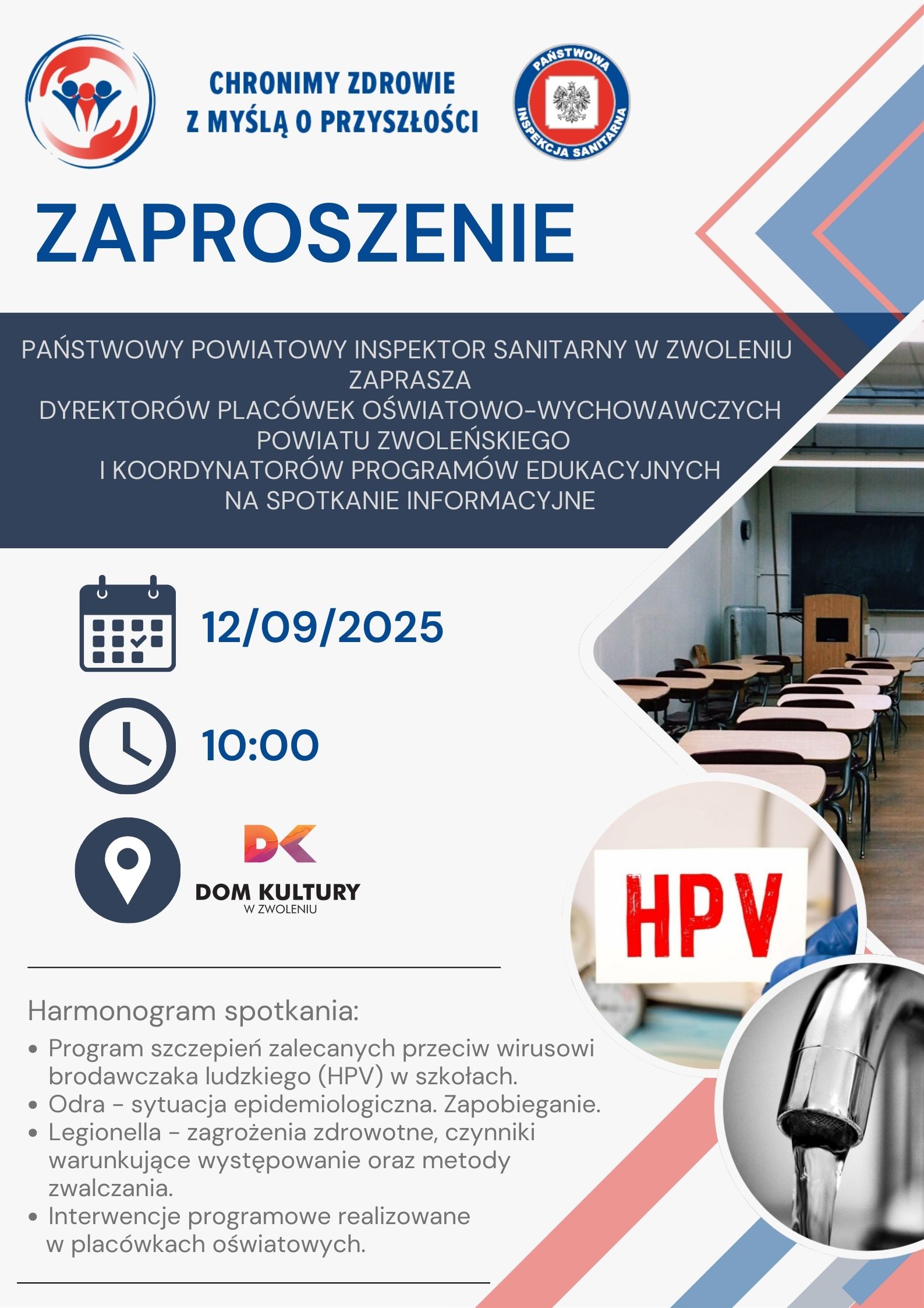 Państwowy Powiatowy Inspektor Sanitarny w Zwoleniu serdecznie zaprasza Dyrektorów placówek oświatowo-wychowawczych powiatu zwoleńskiego i Koordynatorów programów edukacyjnych na spotkanie edukacyjno-informacyjne, które odbędzie się 12 września o godzinie 10:00 w Domu Kultury w Zwoleniu.