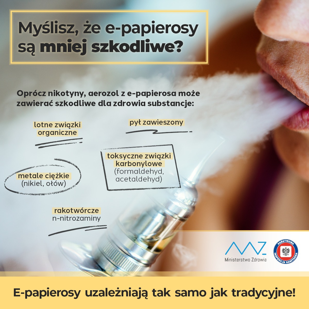 Trzeba wiedzieć, że e-papierosy beznikotynowe również nie są obojętne dla zdrowia, ponieważ w aerozolu wdychanym i wydychanym przez palaczy znajdują się rakotwórcze substancje chemiczne, lotne związki organiczne, aromaty, metale ciężkie itp.