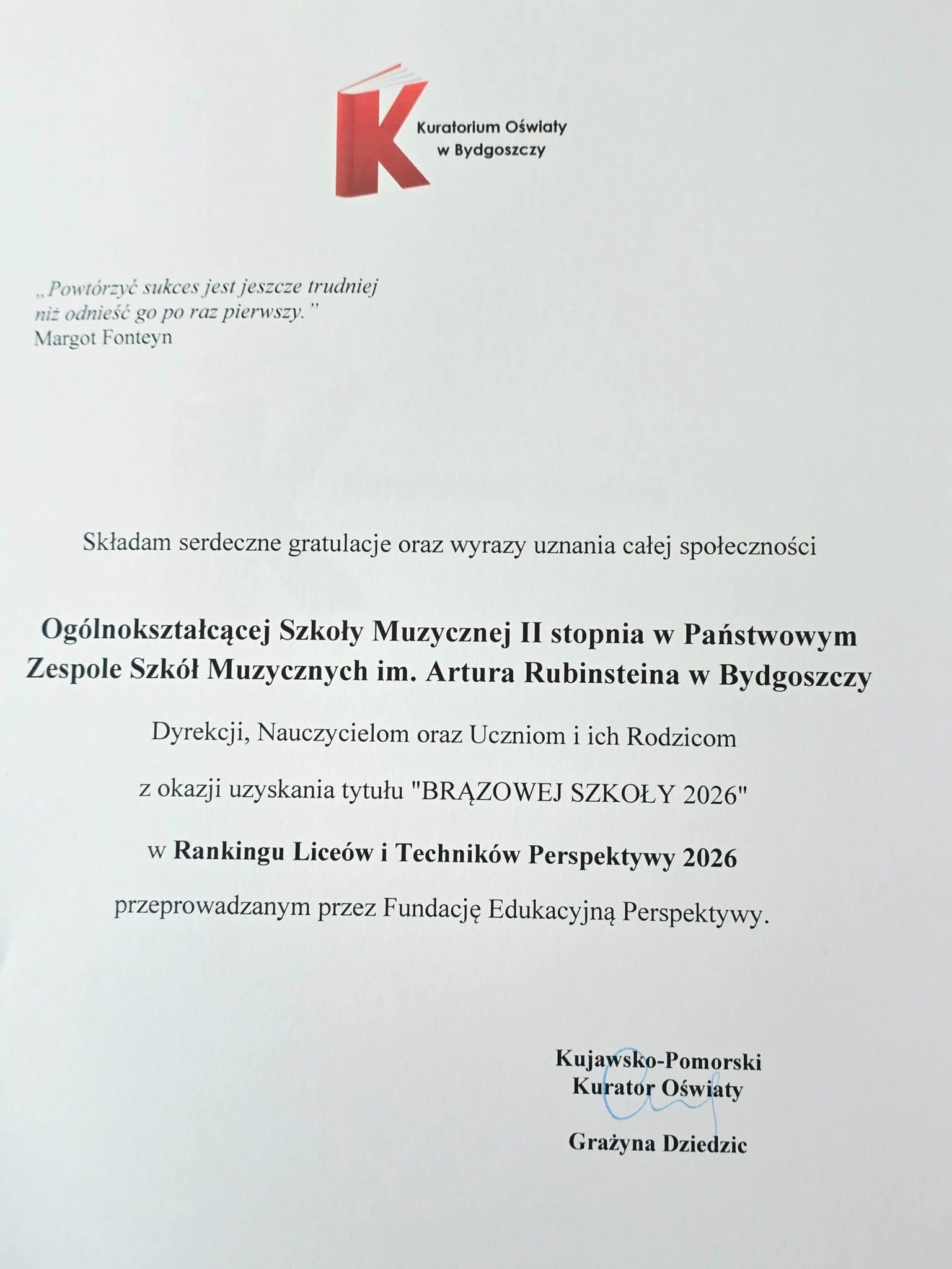 Kolejny wspaniały sukces Państwowego Zespołu Szkół Muzycznych im. Artura Rubinsteina w Bydgoszczy! Nasza Szkoła - Państwowa Ogólnokształcąca Szkoła Muzyczna II stopnia zdobyła TYTUŁ BRĄZOWEJ SZKOŁY 2026 w Rankingu Liceów i Techników 2026. Dziś (2 marca br.) Dyrektor Szkoły dr Joanna Derenda-Łukasik odebrała List Gratulacyjny z rąk Kujawsko-Pomorskiego Kurator Oświaty, Pani Grażyny Dziedzic oraz Wicewojewody Kujawsko-Pomorskiego, Pana Michała Koniucha podczas uroczystego spotkania w Kujawsko-Pomorskim Urzędzie Wojewódzkim w Bydgoszczy. Ponadto, nasz Uczeń, Mikołaj Balcer z klasy akordeonu Pana dr Krzysztofa Lutrzykowskiego zaprezentował koncert, przyjęty gromkimi oklaskami. GratulujeMY bardzo serdecznie Nauczycielom, Uczniom i ich Rodzicom. Brawo!