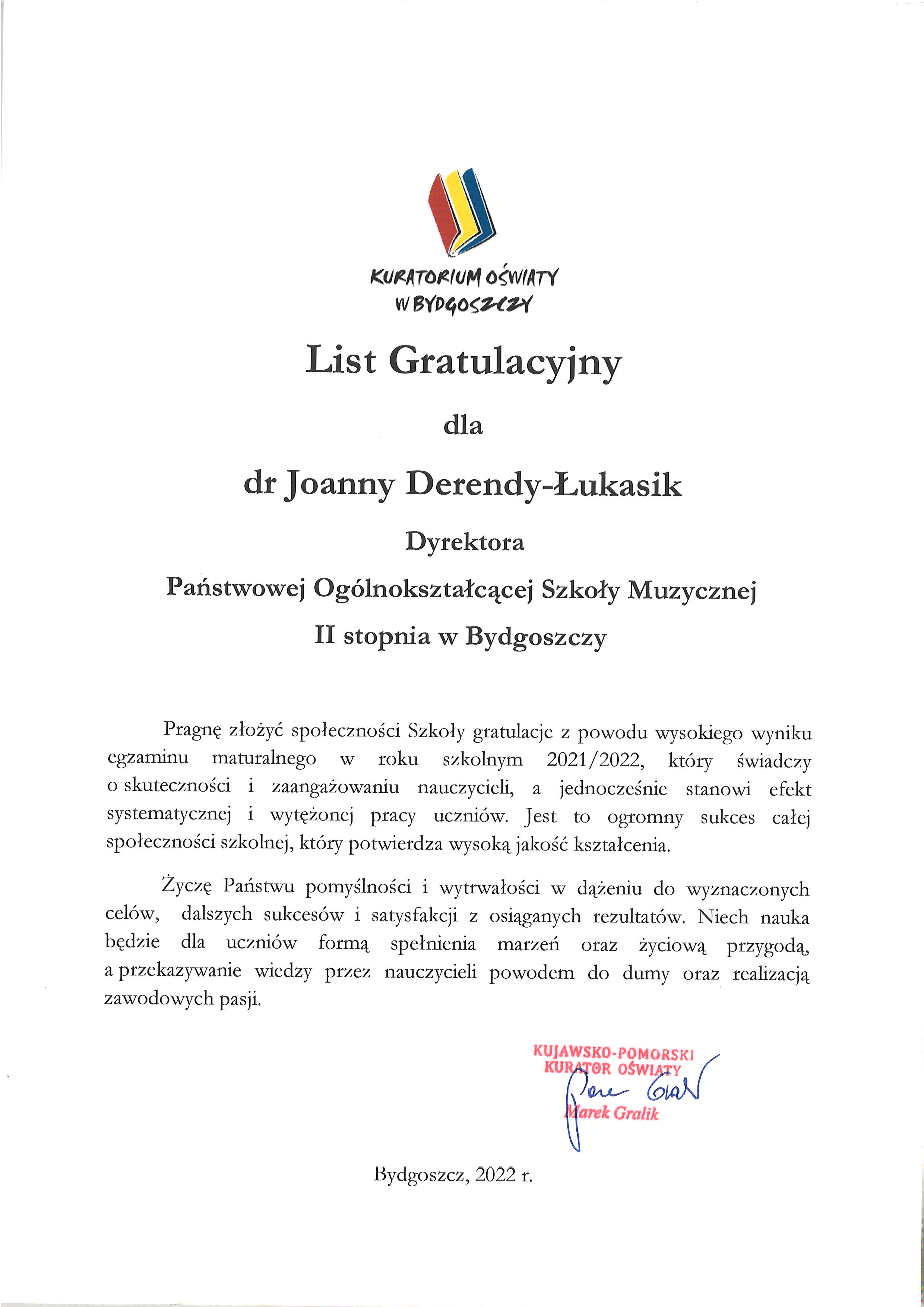 W Dniu Edukacji Narodowej na ręce Pani Dyrektor, Pan Kurator Marek Gralik przesłał gratulacje dla społeczności Szkoły, w związku z uzyskaniem przez uczniów w roku szkolnym 2021/2022 wysokch wyników na egzaminie maturalnym oraz egzaminie ósmoklasisty.