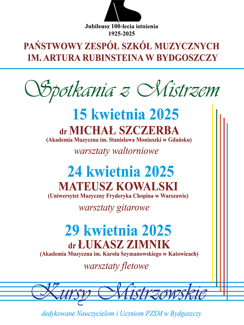 W kwietniu, w naszej Szkole odbędą się lekcje mistrzowskie dla Nauczycieli i Uczniów. Będą to warsztaty waltorniowe, fletowe i gitarowe.