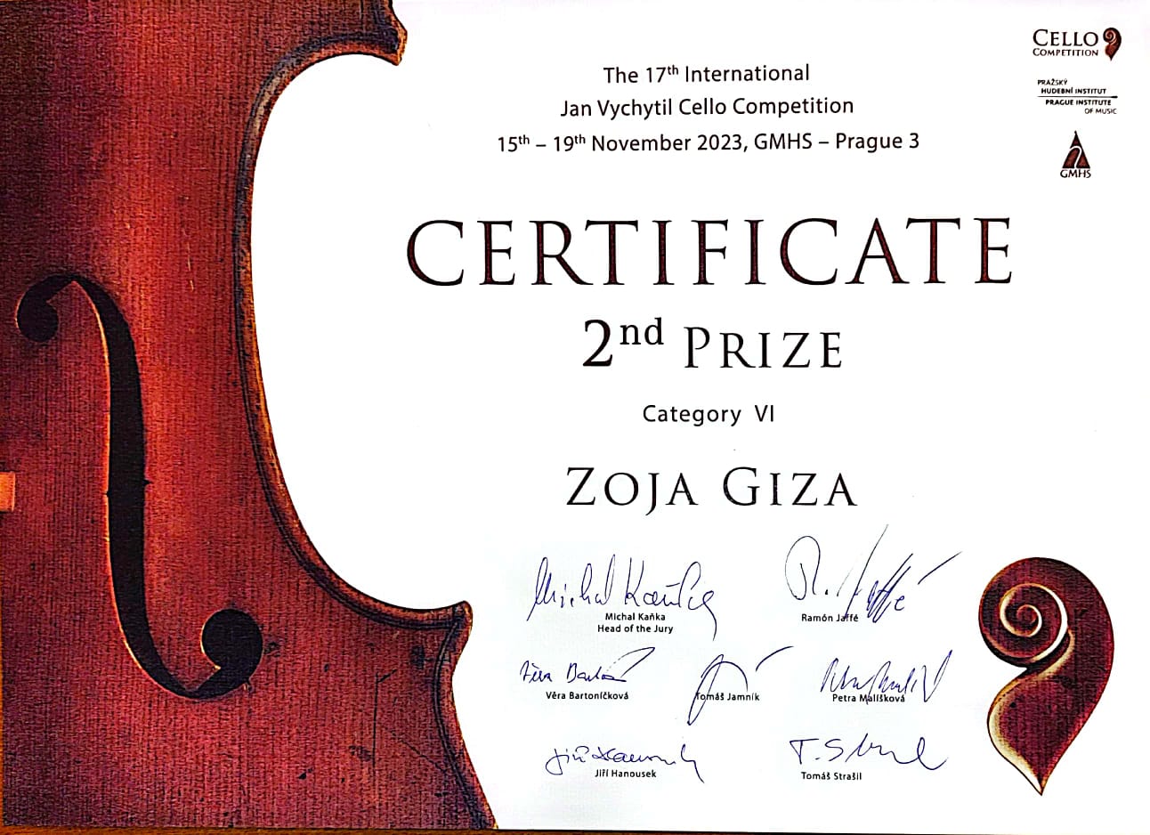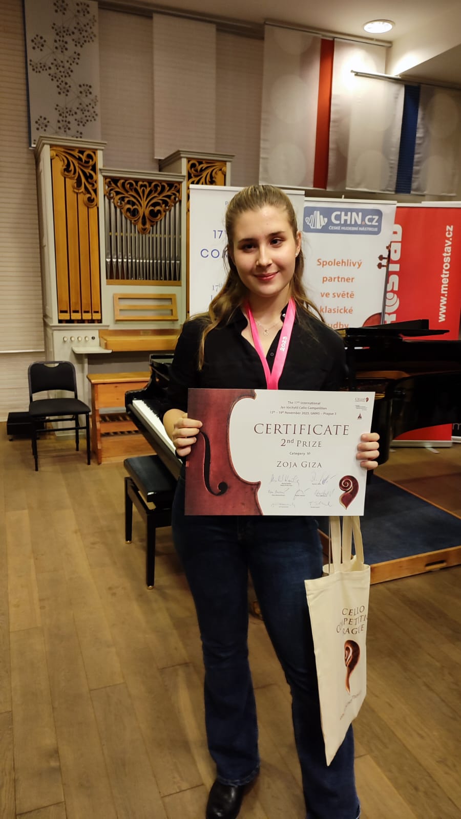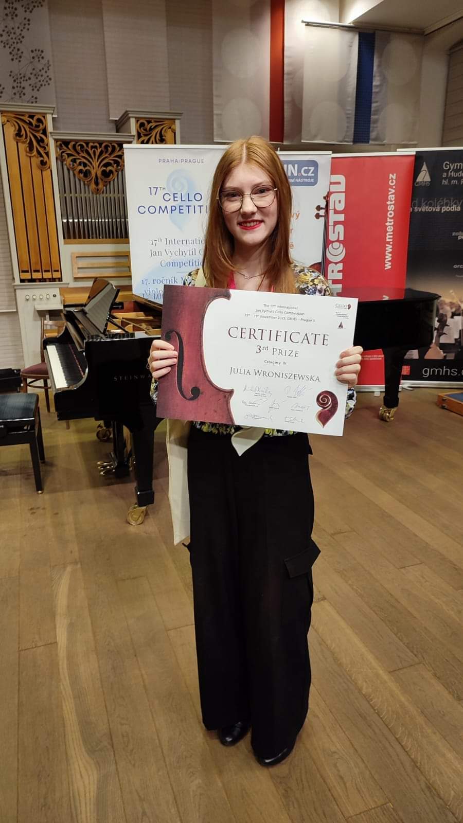 Kolejne międzynarodowe sukcesy naszych Uczennic z klasy wiolonczeli Pani Iwony Michalak. Brawo Zoja Giza i Julia Wroniszewska! Wiolonczelistom podczas konkursu w Pradze towarzyszył przy fortepianie Pan Adam Zok.
