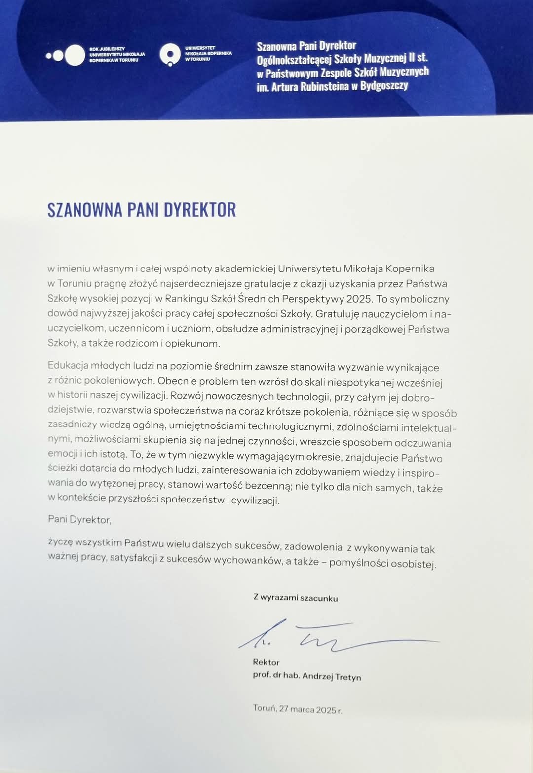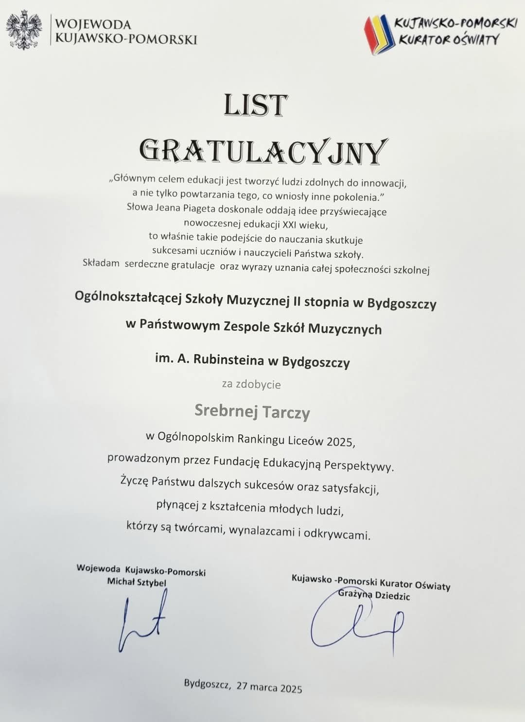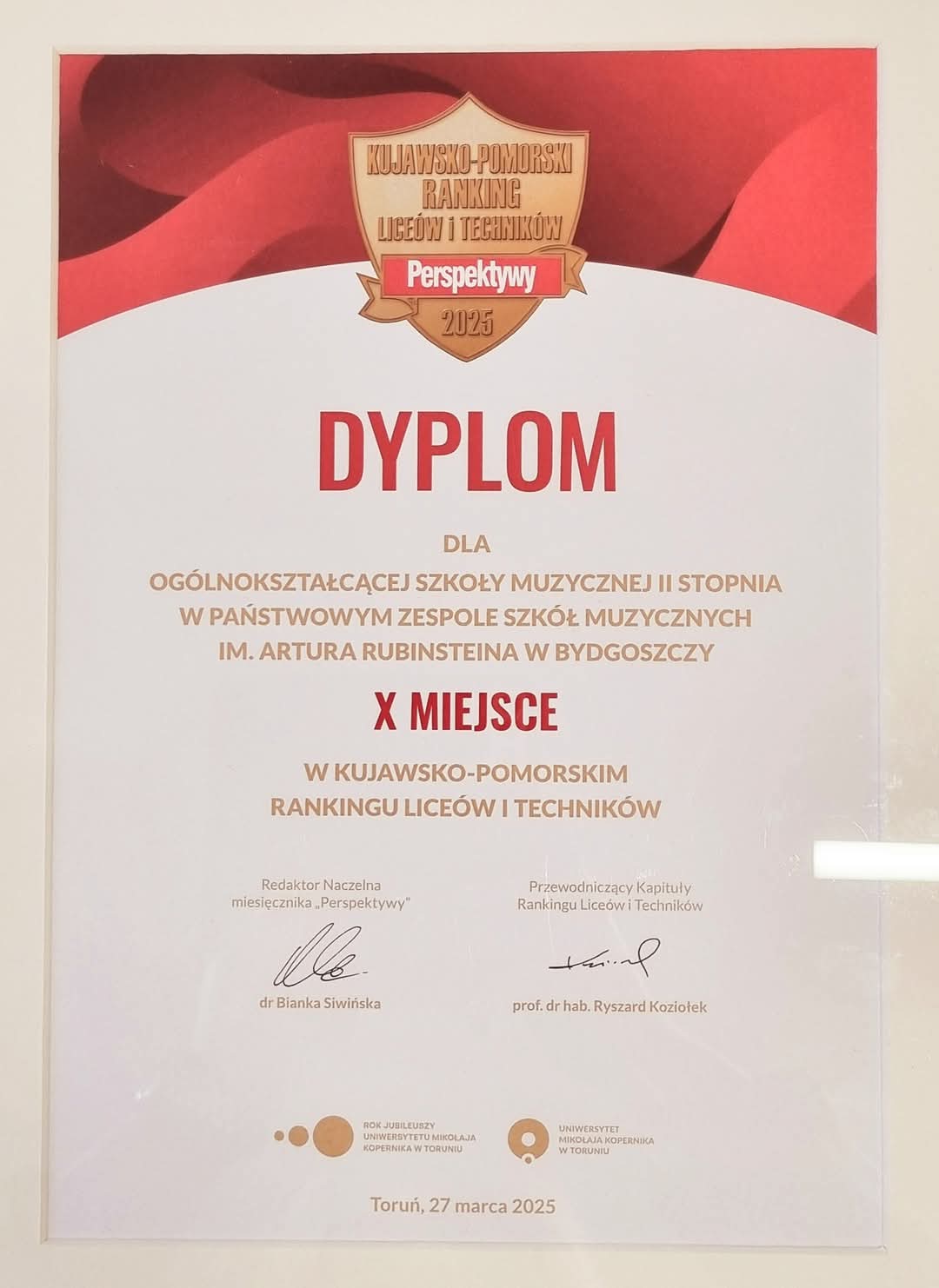 Nasza Ogólnokształcąca Szkoła Muzyczna II stopnia z prestiżowym wyróżnieniem! - otrzymaliśmy SREBRNĄ TARCZĘ w Ogólnopolskim Rankingu Liceów 2025 prowadzonym przez Fundację Edukacyjną Perspektywy. 27 marca 2025, Dyrektor dr Joanna Derenda-Łukasik odebrała wyróżnienie dla naszej Państwowej Ogólnokształcącej Szkoły Muzycznej II stopnia! Uhonorowanie najlepszych szkół ponadpodstawowych w województwie było głównym punktem Gali Kujawsko-Pomorskiego Rankingu Liceów i Techników "Perspektywy" 2025, której gospodarzem był Uniwersytet Mikołaja Kopernika w Toruniu. Podczas uroczystości okolicznościowe dyplomy trafiły do najlepszych 35 placówek. Nasza POSM II z wynikiem w pierwszej 10. najlepszych Liceów w Kujawsko-Pomorskim! GratulujeMY naszym Uczniom, Absolwentom (zeszłorocznym Maturzystom) i Nauczycielom! Zapraszamy do zapoznania się z fotorelacją poniżej.