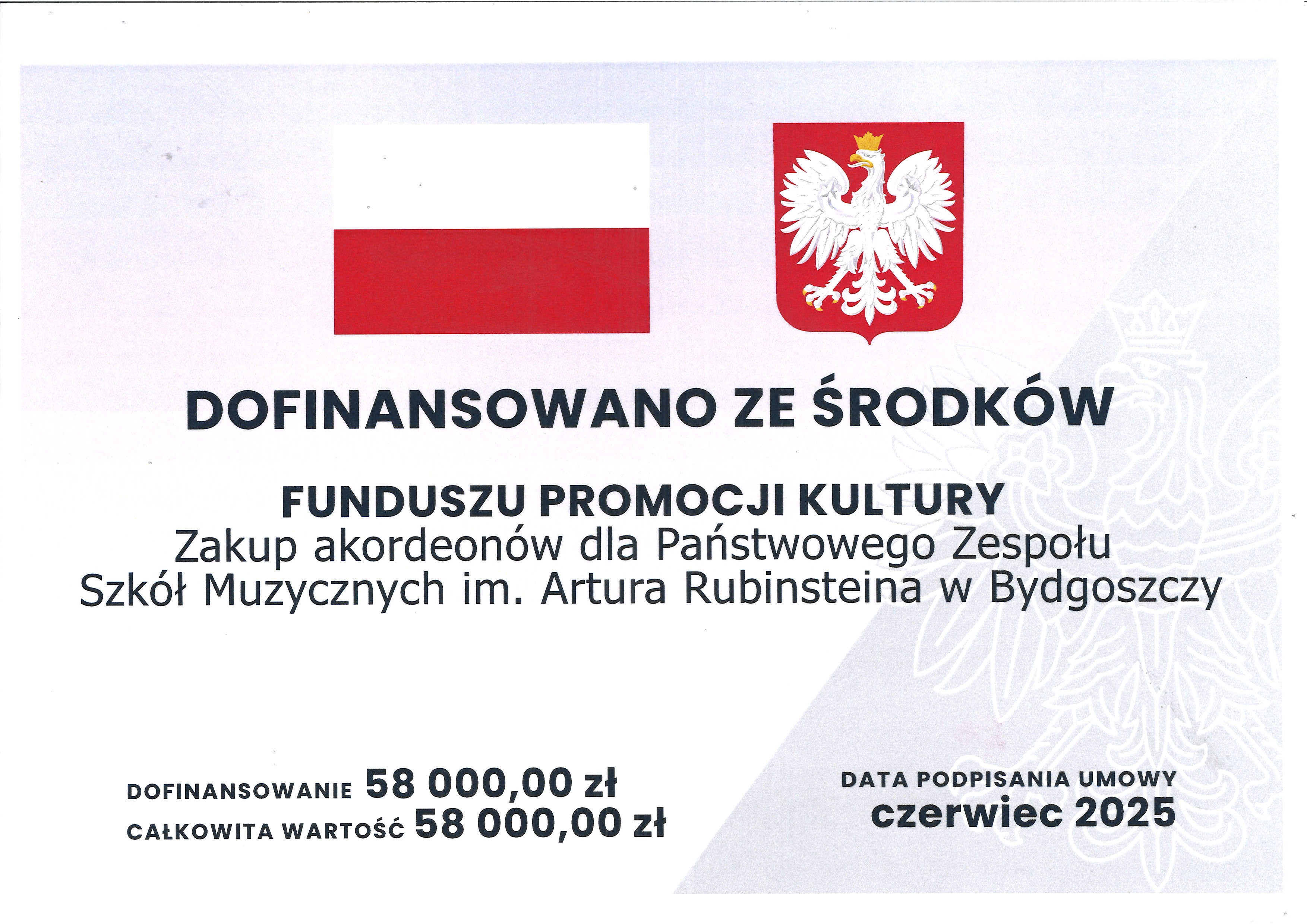 Zadanie pt. Zakup akordeonów dla Państwowego Zespołu Szkół Muzycznych im. Artura Rubinsteina w Bydgoszczy „Dofinansowano ze środków Ministra Kultury i Dziedzictwa Narodowego pochodzących z Funduszu Promocji Kultury – państwowego funduszu celowego”