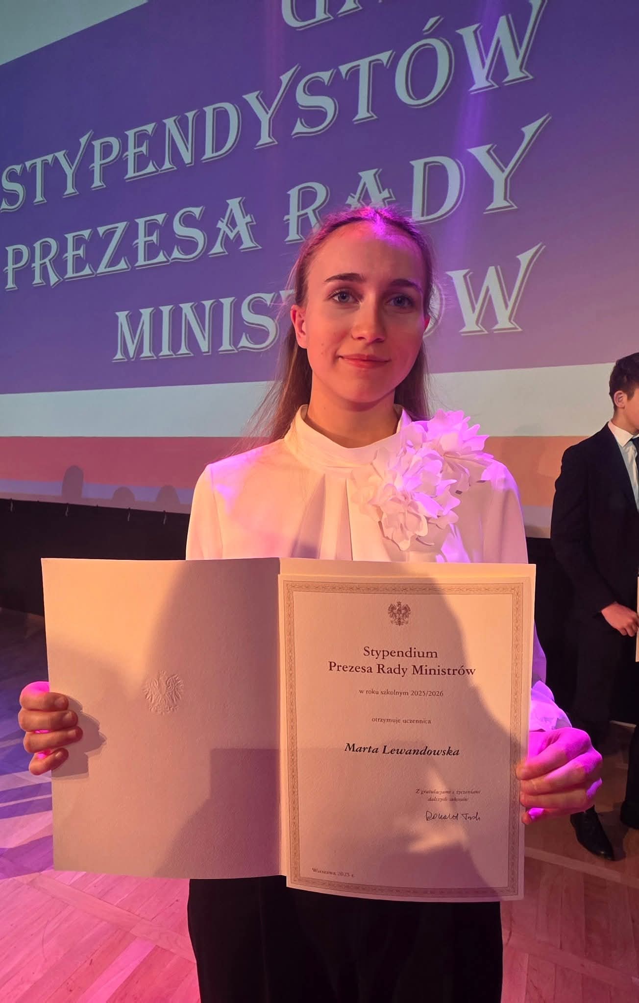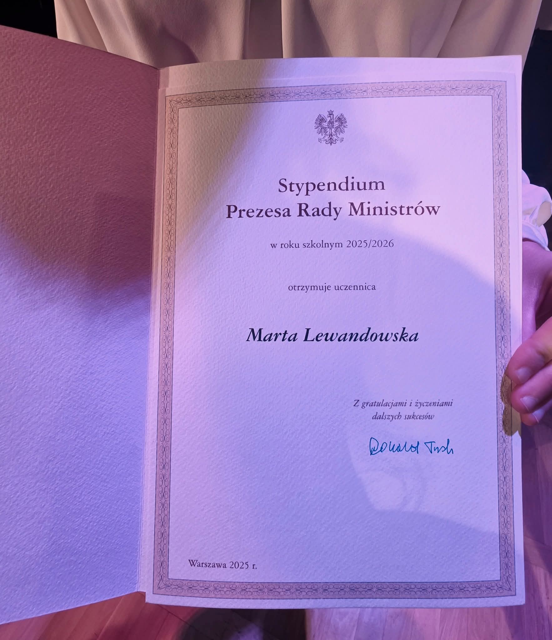 Gratulujemy bardzo serdecznie naszej Uczennicy, Marcie Lewandowskiej otrzymania niezwykłego wyróżnienia - Stypendium Prezesa Rady Ministrów w roku szkolnym 2025/2026. Na zdjęciach Laureatka Marta Lewandowska wraz z dyrektor Szkoły, Panią dr Joanną Derendą-Łukasik.