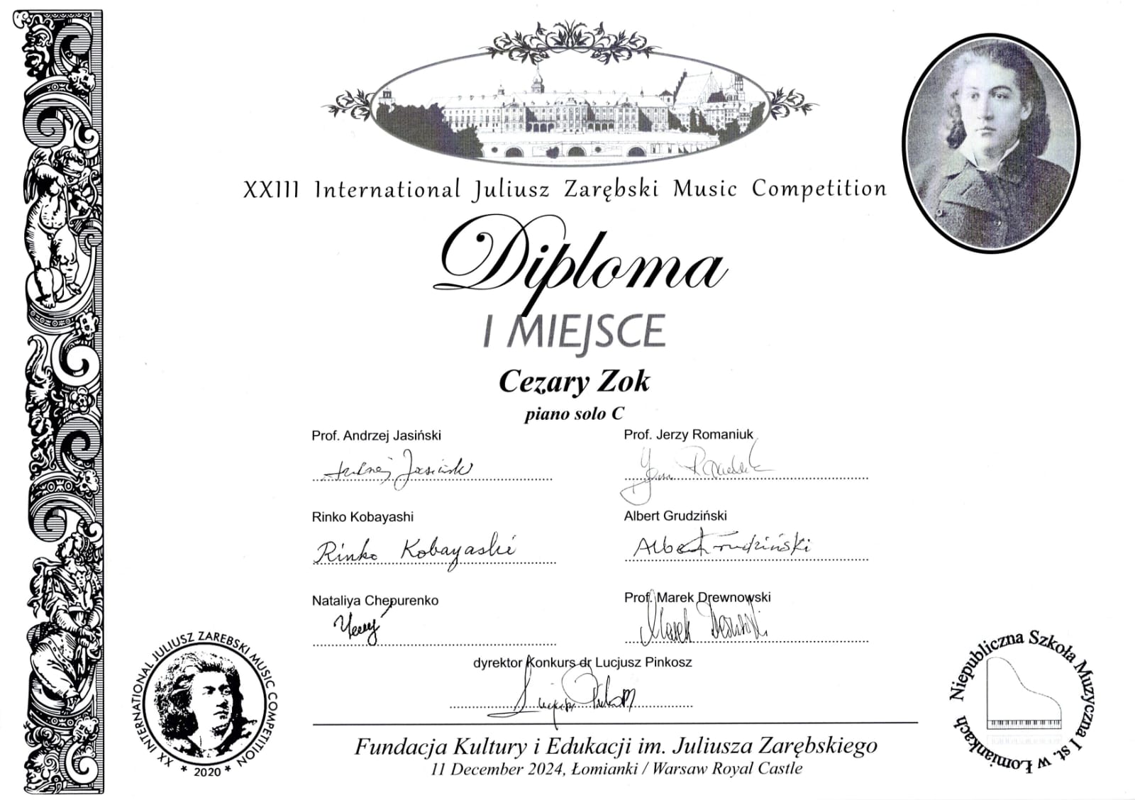 Nasz Uczeń Cezary Zok z klasy fortepianu dr hab. Magdaleny Swatowskiej zdobył I NAGRODĘ w Międzynarodowym Konkursie Juliusza Zarębskiego i zaprezentował się podczas koncertu laureatów na Zamku Królewskim w Warszawie.