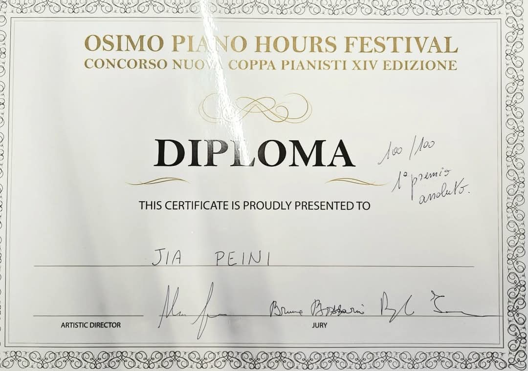Nasza Uczennica Jia Peini z klasy fortepianu Profesor Marii Murawskiej otrzymała I NAGRODĘ w Concorso Nuova Coppa Pianisti XIV edizione - Osimo Piano Hours Festival.