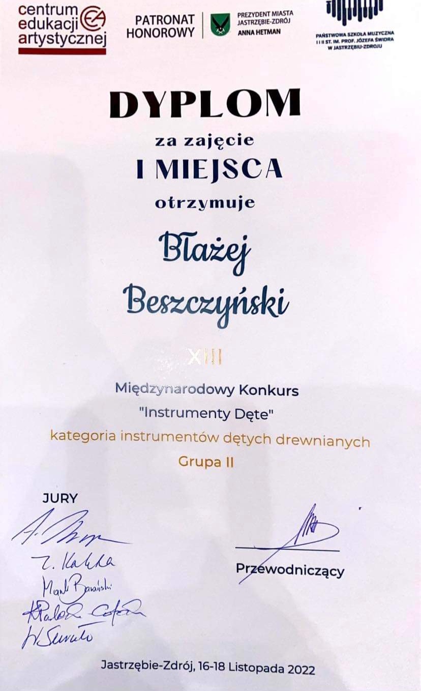 Niezwykle prestiżowy i wymagający Międzynarodowy Konkurs Instrumentów Dętych w Jastrzębiu Zdroju! I NAGRODA dla Pawła Libronta z klasy klarnetu Andrzeja Dudzińskiego oraz I NAGRODA dla Błażeja Beszczyńskiego z klasy fagotu Zdzisława Dworzyńskiego, przy fortepianie prezentacje konkursowe współtworzyła Pani Kaja Papierska. Gratulujemy!