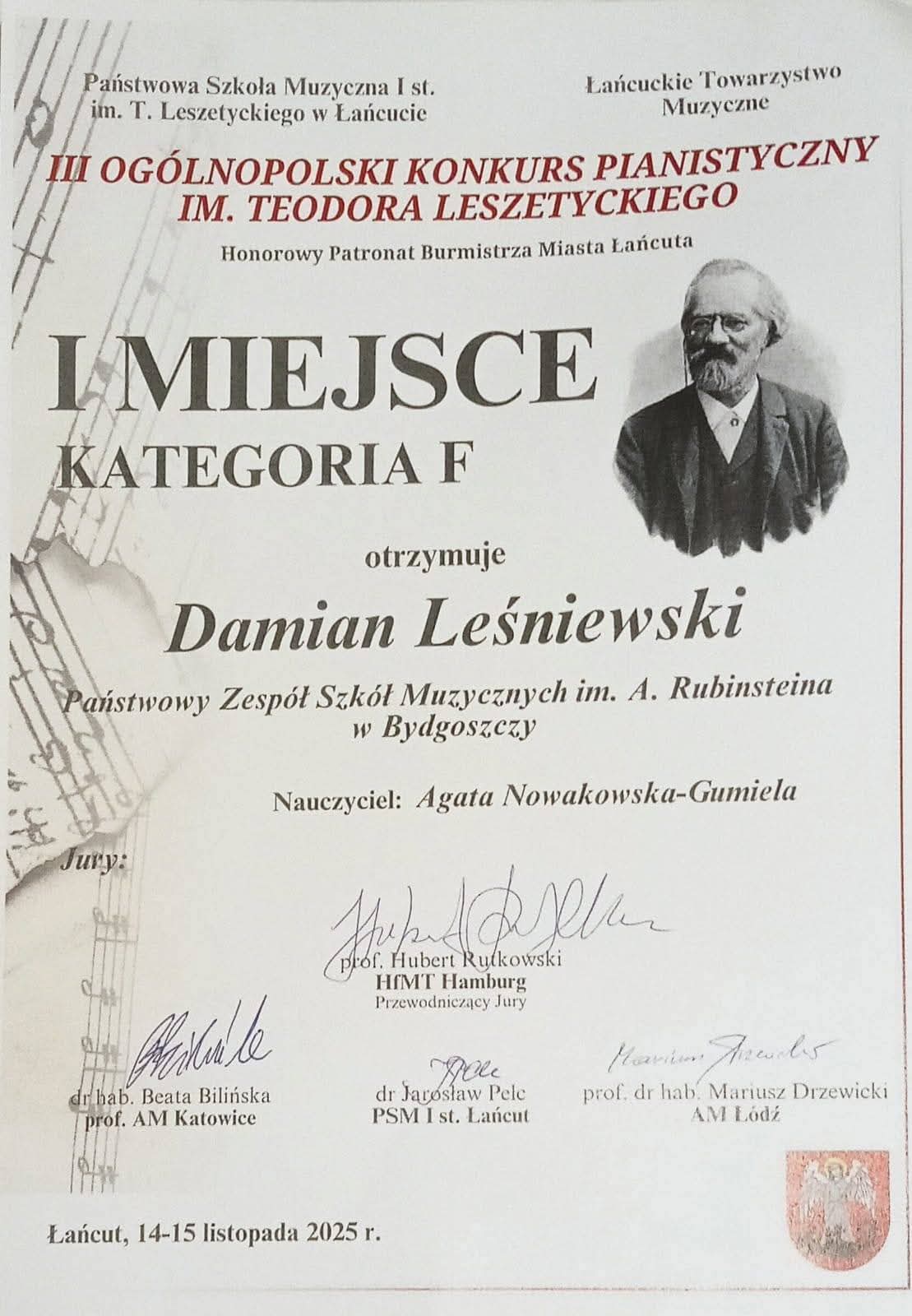 Nasz Uczeń, Damian Leśniewski z klasy fortepianu dr hab. Agaty Nowakowskiej-Gumieli zdobył I MIEJSCE w III Ogólnopolskim Konkursie Pianistycznym im. Teodora Leszetyckiego w Łańcucie! Bardzo serdecznie gratulujemy Damianowi i Pani Profesor!
